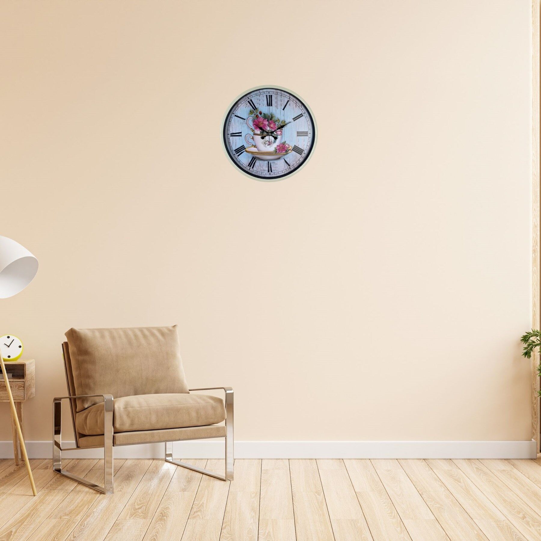 Zarif ve nostaljik tasarımıyla dikkat çeken 36 cm krem duvar saati, çiçekli fincan temalı dekoratif kadranı ile yaşam alanlarınıza sıcak ve estetik bir hava kazandırır. Vintage görünümlü arka planı ve klasik Roma rakamları sayesinde hem dekoratif hem de kolay okunabilir bir kullanım sunar.