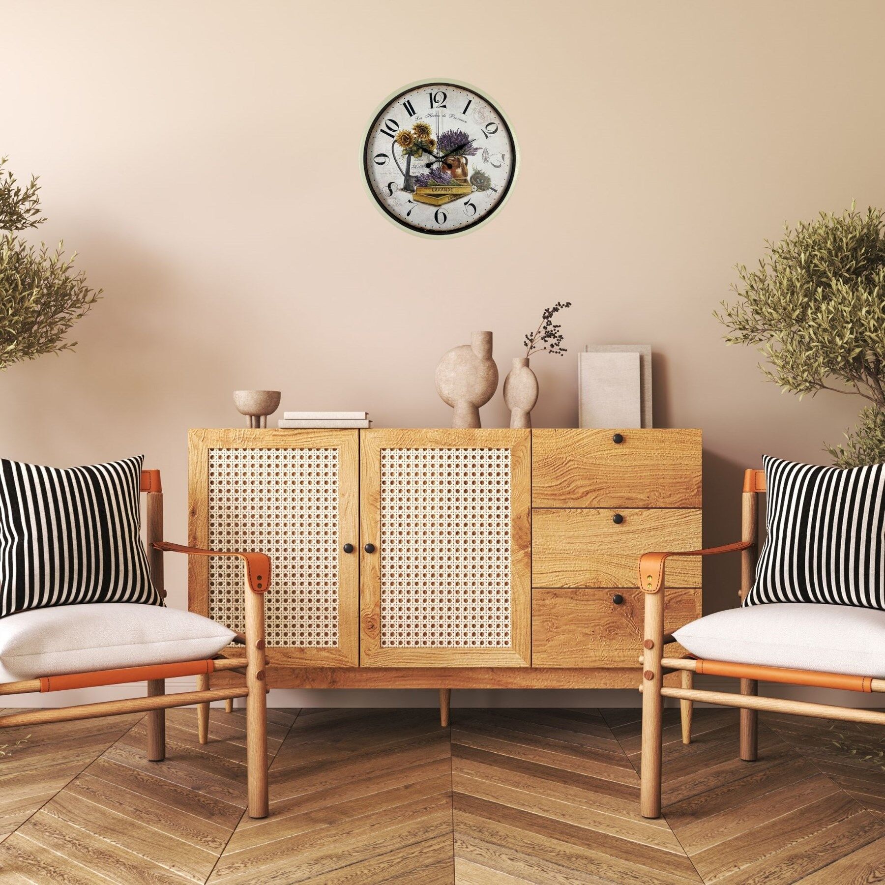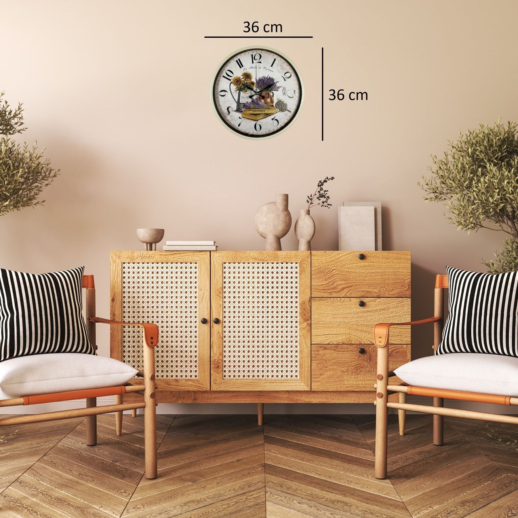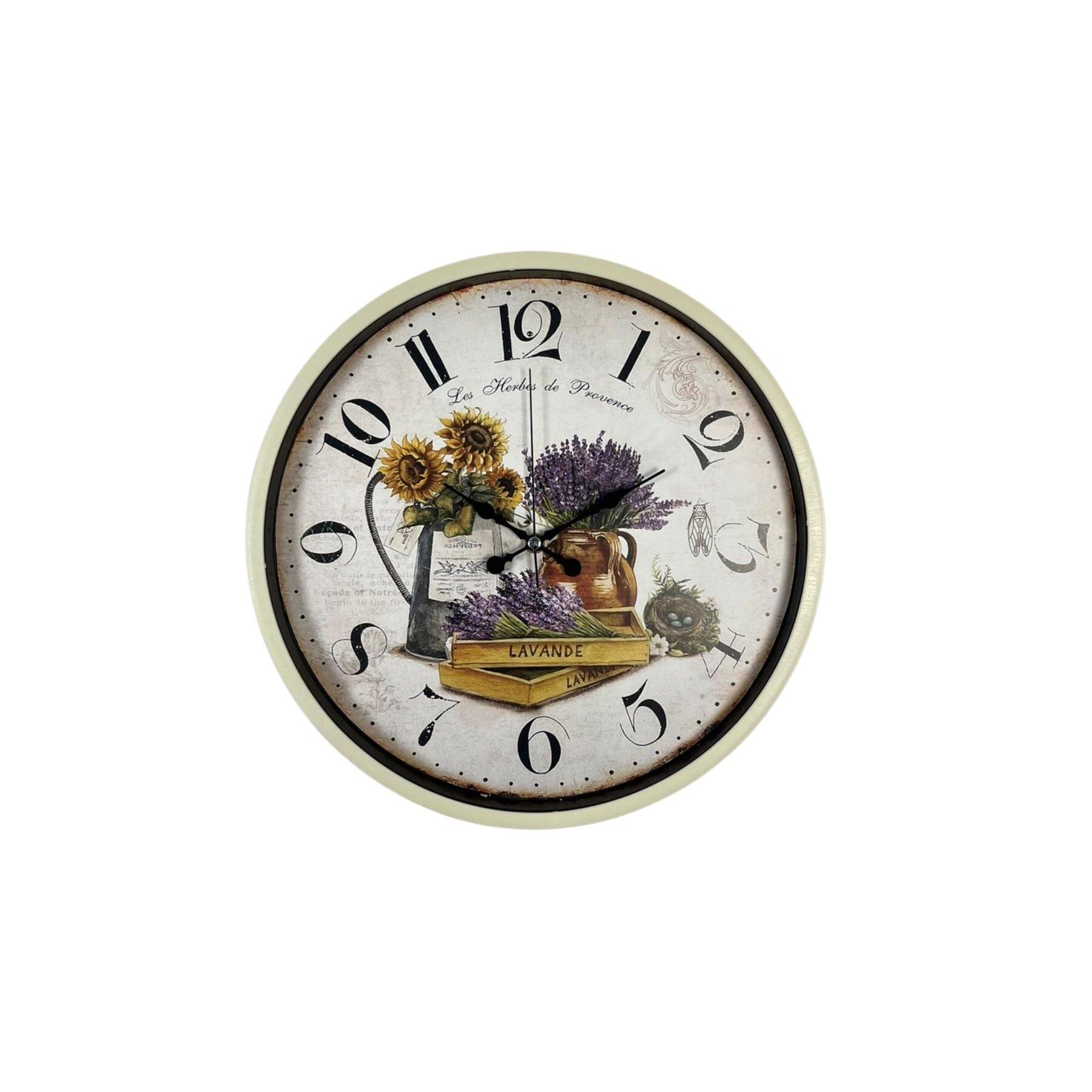 Zarif ve sıcak renk tonlarıyla tasarlanan 36 cm krem duvar saati, Provence esintili lavanta ve ayçiçeği desenli kadranı ile yaşam alanlarınıza nostaljik ve dekoratif bir atmosfer kazandırır. Vintage tarzı tasarımı sayesinde mutfak, salon, oturma odası, kafe ve restoran dekorasyonlarında şık bir tamamlayıcı olarak kullanılabilir.