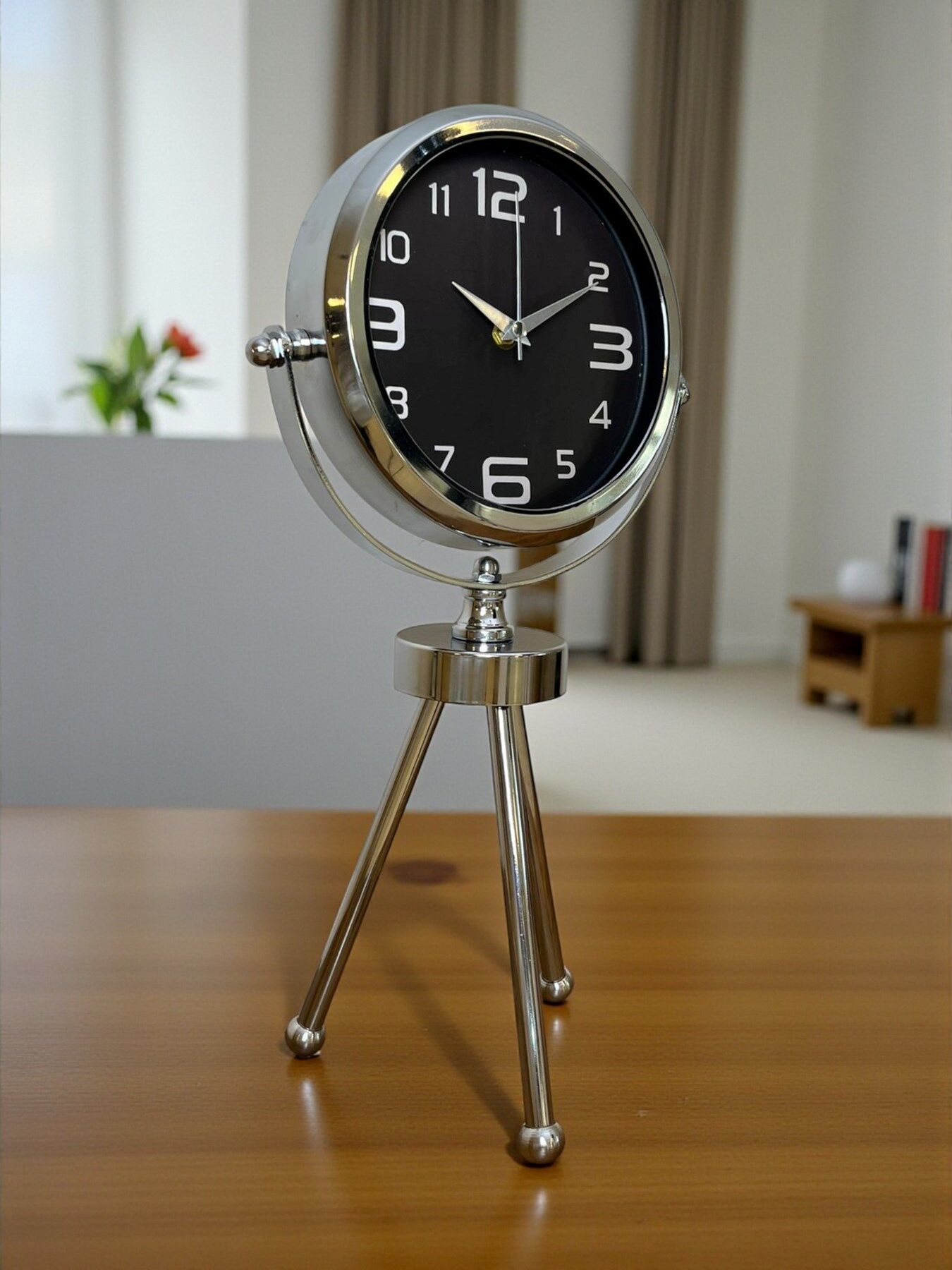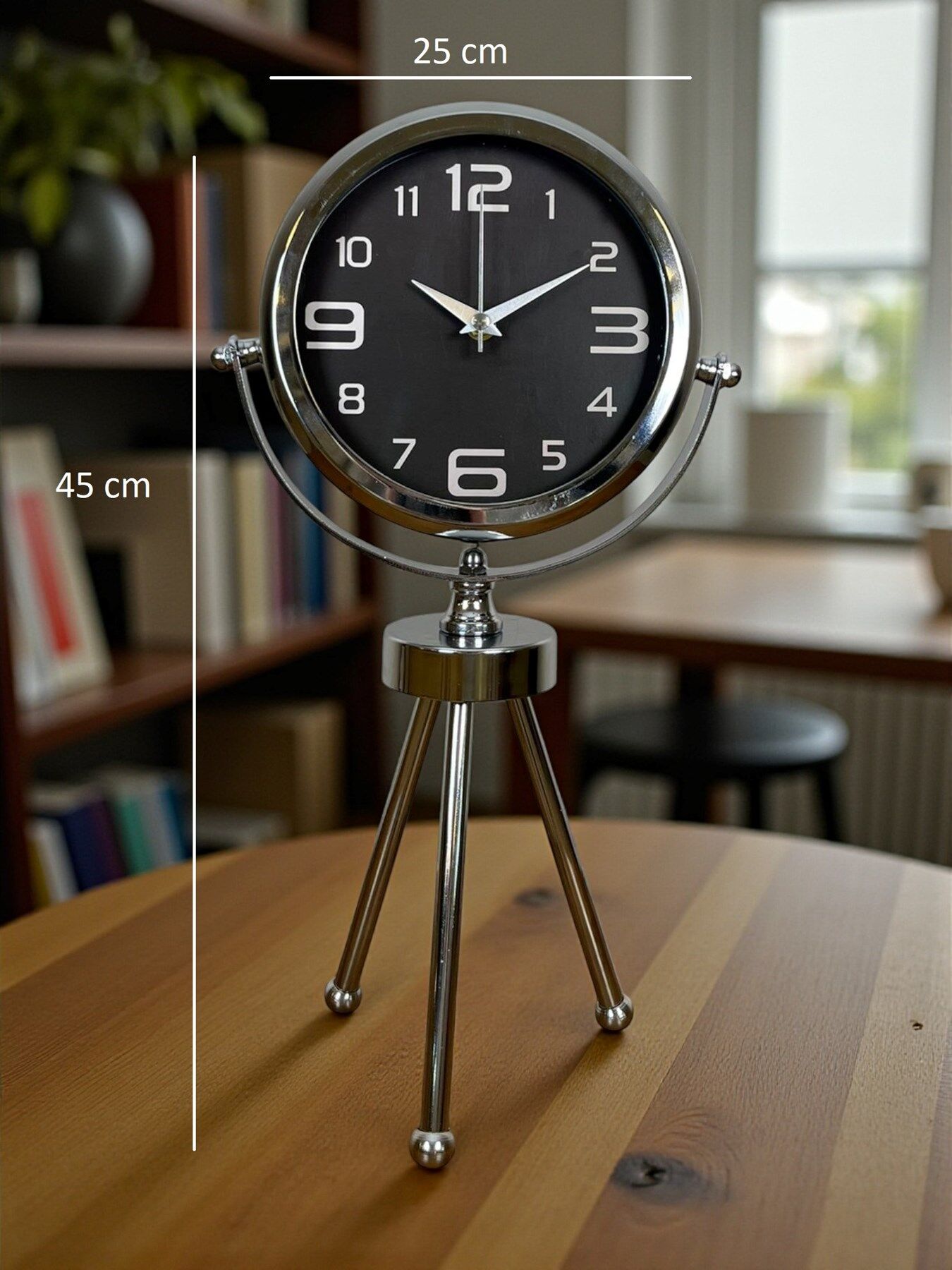 45 x 25 cm ölçülerindeki bu şık krom üç ayaklı masa saati, modern tasarımı ve parlak metal gövdesiyle her ortamda dikkat çeken zarif bir dekorasyon ürünüdür. Gerçek cam korumalı kadranı sayesinde uzun ömürlü ve net bir görüntü sunar. Sessiz çalışan mekanizması ile ev, ofis ve çalışma alanlarında konforlu bir kullanım sağlar. Dayanıklı metal tripod ayak yapısı, saati sadece bir zaman göstergesi değil aynı zamanda estetik bir obje haline getirir.