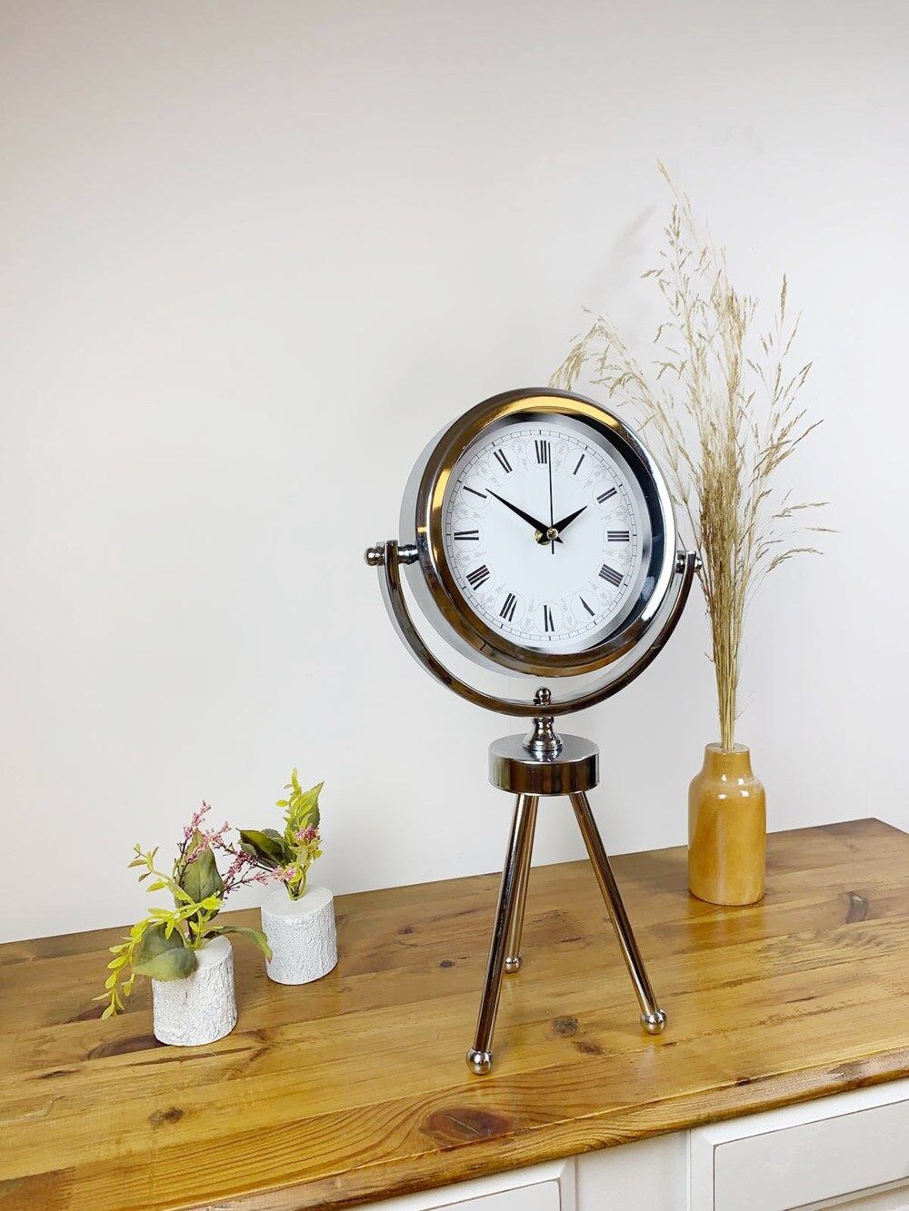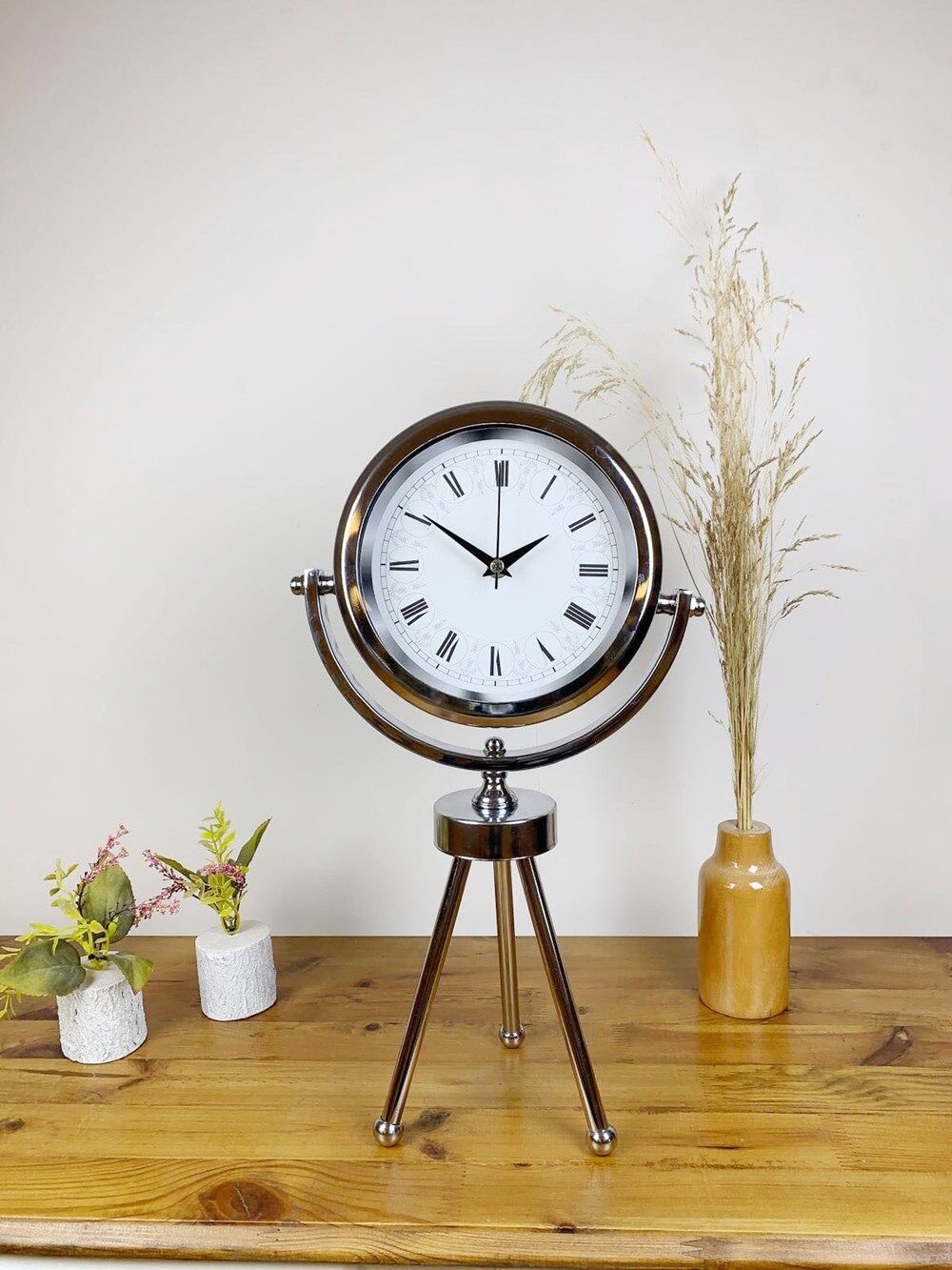 Şık ve modern tasarımıyla dikkat çeken krom kaplama mini tripod masa saatimiz, sessiz akar saniye mekanizmasıyla konforlu bir kullanım sunar. Gerçek cam koruma paneli sayesinde uzun ömürlü ve dayanıklıdır. Estetik görünümüyle hem ev hem de iş yerleri için ideal bir dekoratif üründür.