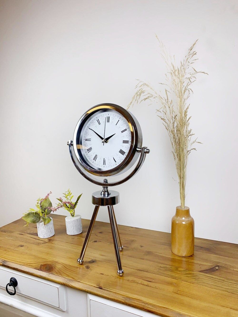 Krom Metal Mini Tripod Desenli Roma Rakamlı Masa Saati