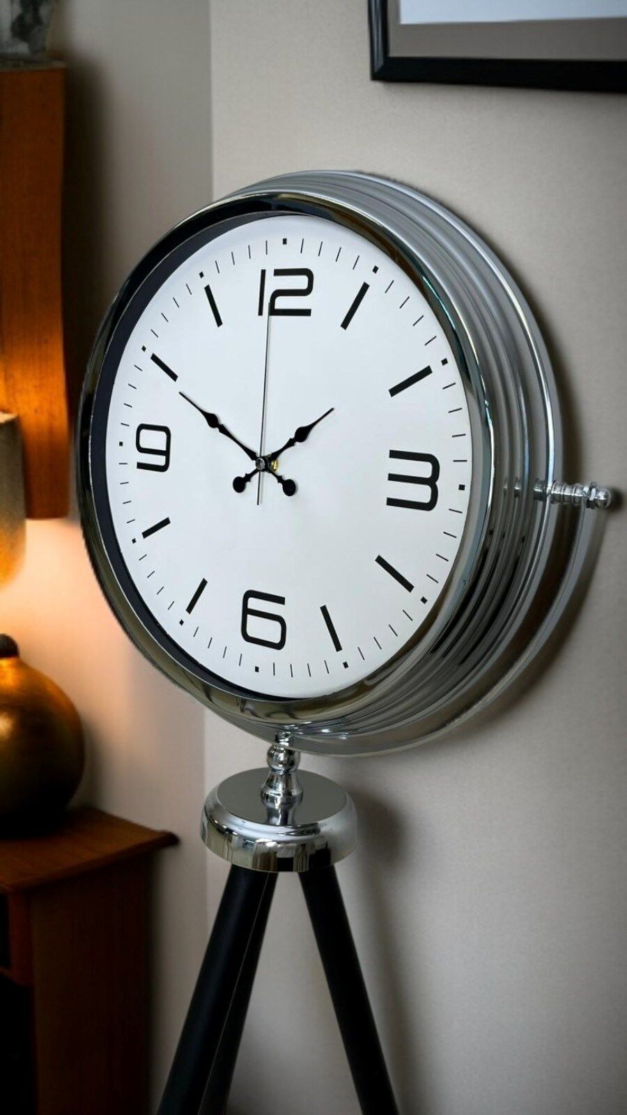 Modern tasarımı, dengeli duruşu ve zamansız şıklığıyla öne çıkan bu krom tripod ayaklı saat, klasik saat modellerinden farklı olarak yalnızca zamanı göstermekle kalmaz; bulunduğu mekâna güçlü bir dekoratif etki kazandırır. 150 cm yüksekliği ve 45 cm genişliği sayesinde geniş alanlarda dikkat çeken bir odak noktası oluşturur ve dekorasyonun merkezinde yer alır.