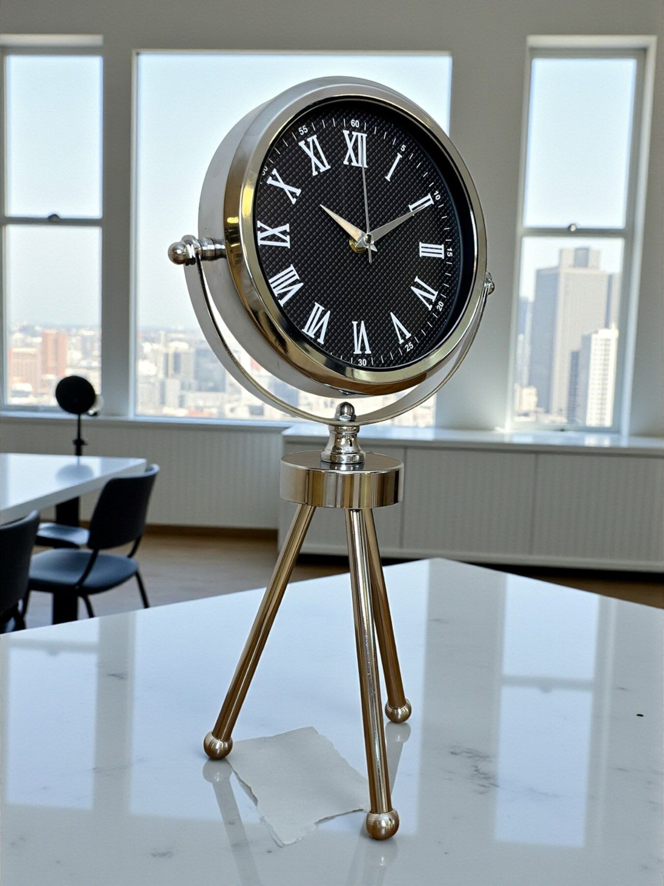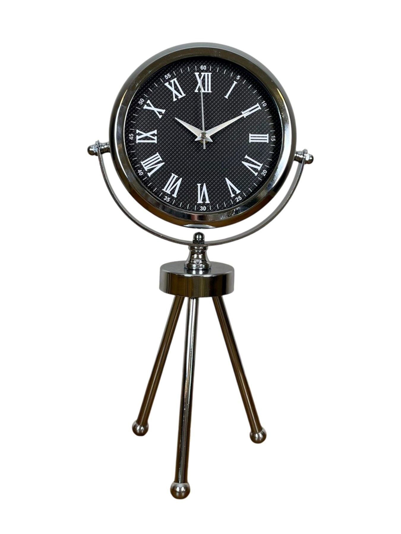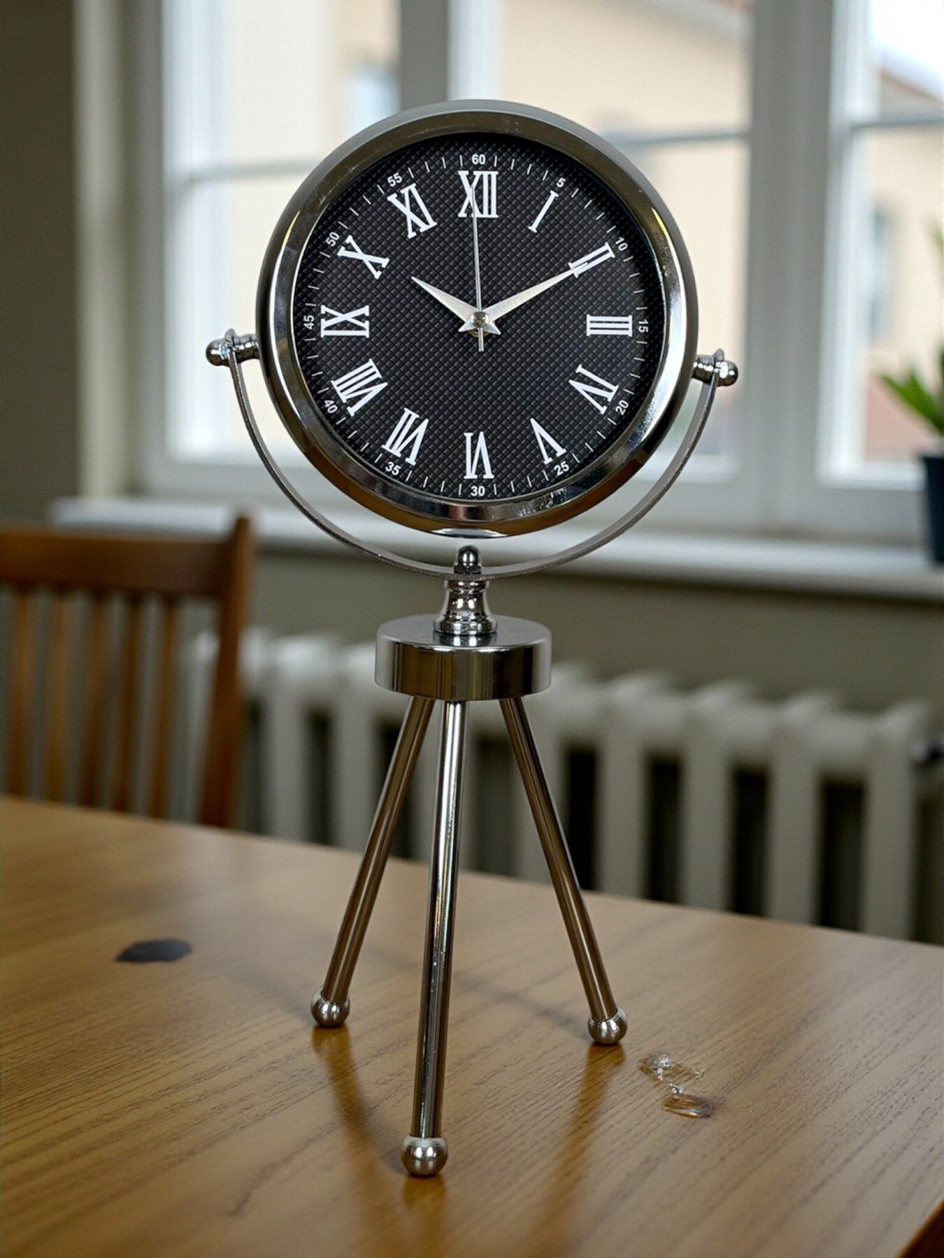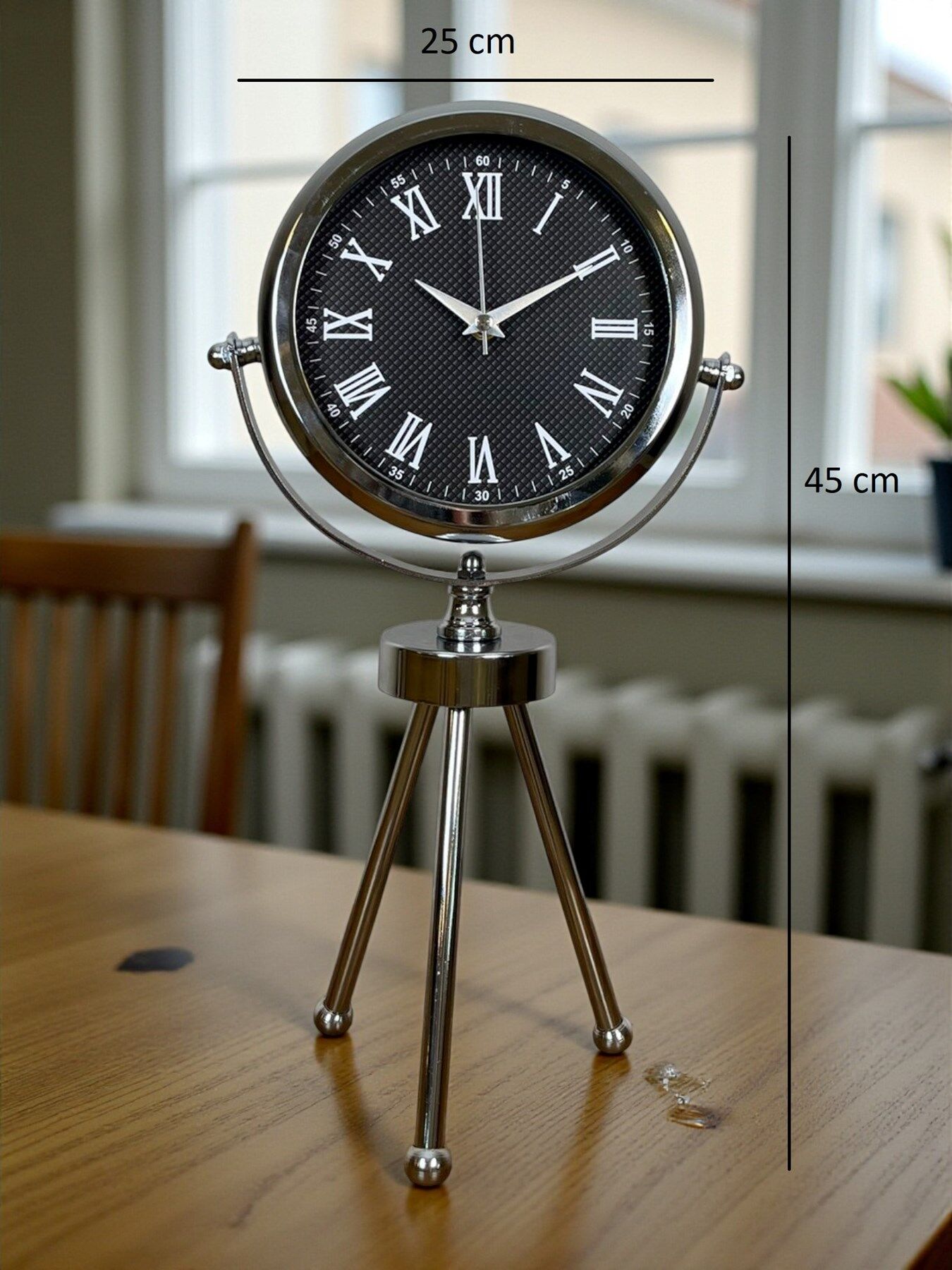 45 x 25 cm ölçülerindeki bu şık krom üç ayaklı masa saati, modern tasarımı ve parlak metal gövdesiyle her ortamda dikkat çeken zarif bir dekorasyon ürünüdür. Gerçek cam korumalı kadranı sayesinde uzun ömürlü ve net bir görüntü sunar. Sessiz çalışan mekanizması ile ev, ofis ve çalışma alanlarında konforlu bir kullanım sağlar. Dayanıklı metal tripod ayak yapısı, saati sadece bir zaman göstergesi değil aynı zamanda estetik bir obje haline getirir.