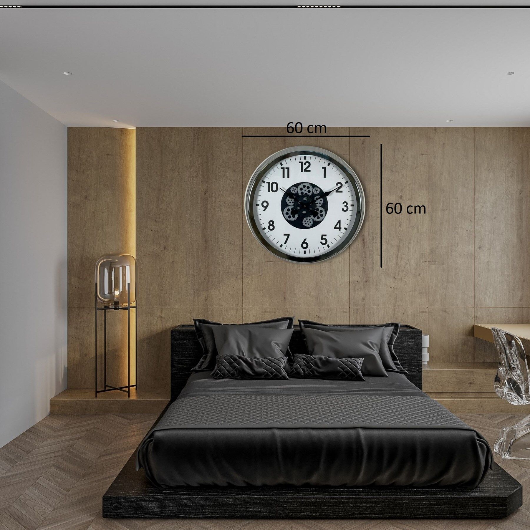 Modern krom çerçevesi, beyaz zemin üzerindeki net siyah rakamları ve hareketli çark tasarımı ile bu 60 cm Çarklı Duvar Saati; hem şık hem güçlü bir dekoratif tamamlayıcıdır.