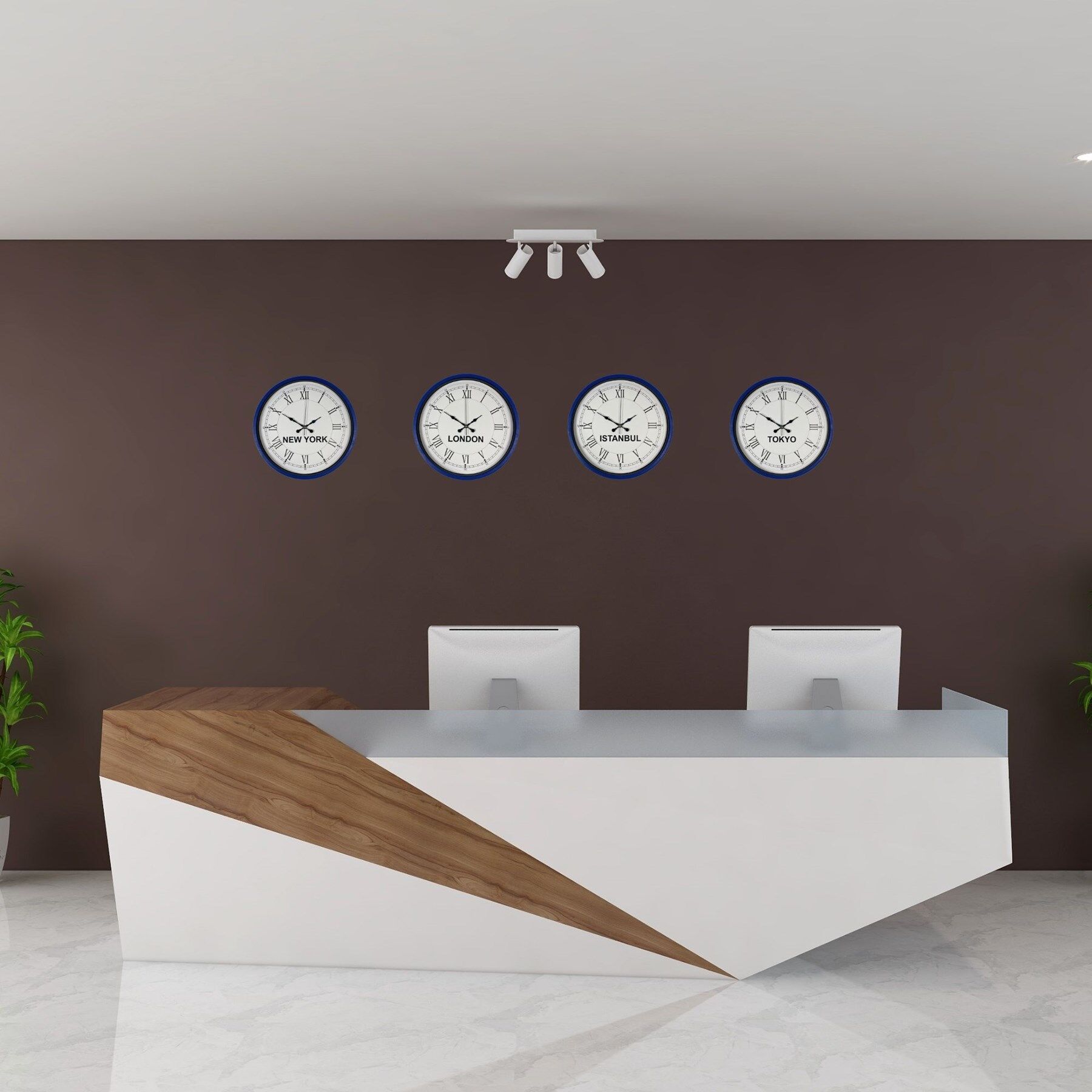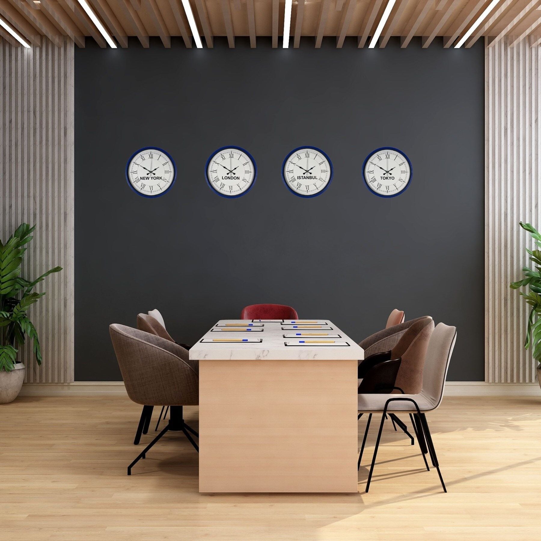 New York, London, Istanbul ve Tokyo saatlerini aynı anda takip etmenizi sağlayan bu özel set; özellikle oteller, resepsiyon alanları, ofisler ve uluslararası çalışan işletmeler için profesyonel ve dekoratif bir çözüm sunar.