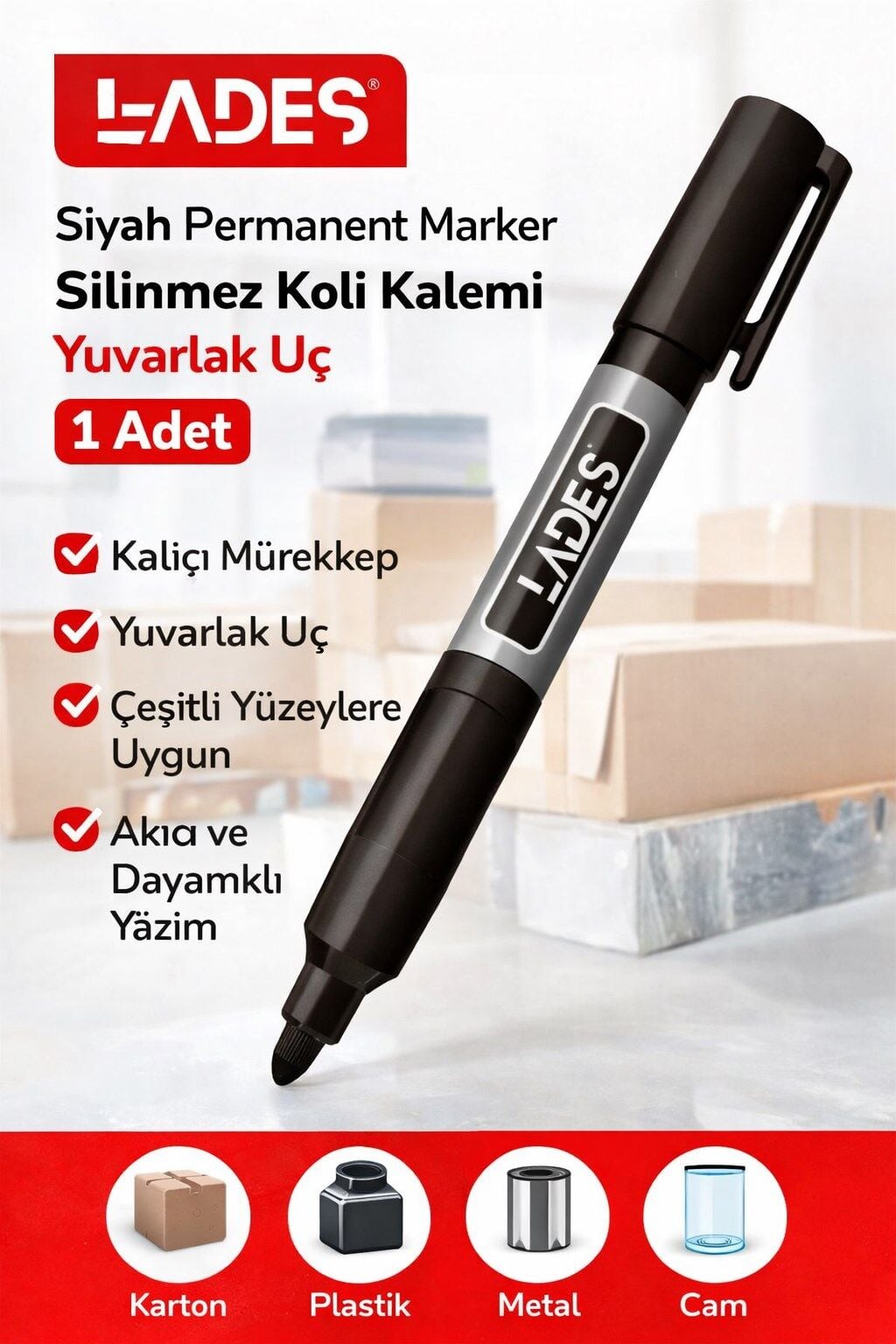 Lades silinmez koli kalemi, kalıcı mürekkep özelliği sayesinde birçok yüzeyde net ve dayanıklı yazım sağlar. Karton koli, plastik, cam, metal ve benzeri yüzeylerde akıcı ve kesintisiz yazım imkanı sunar.