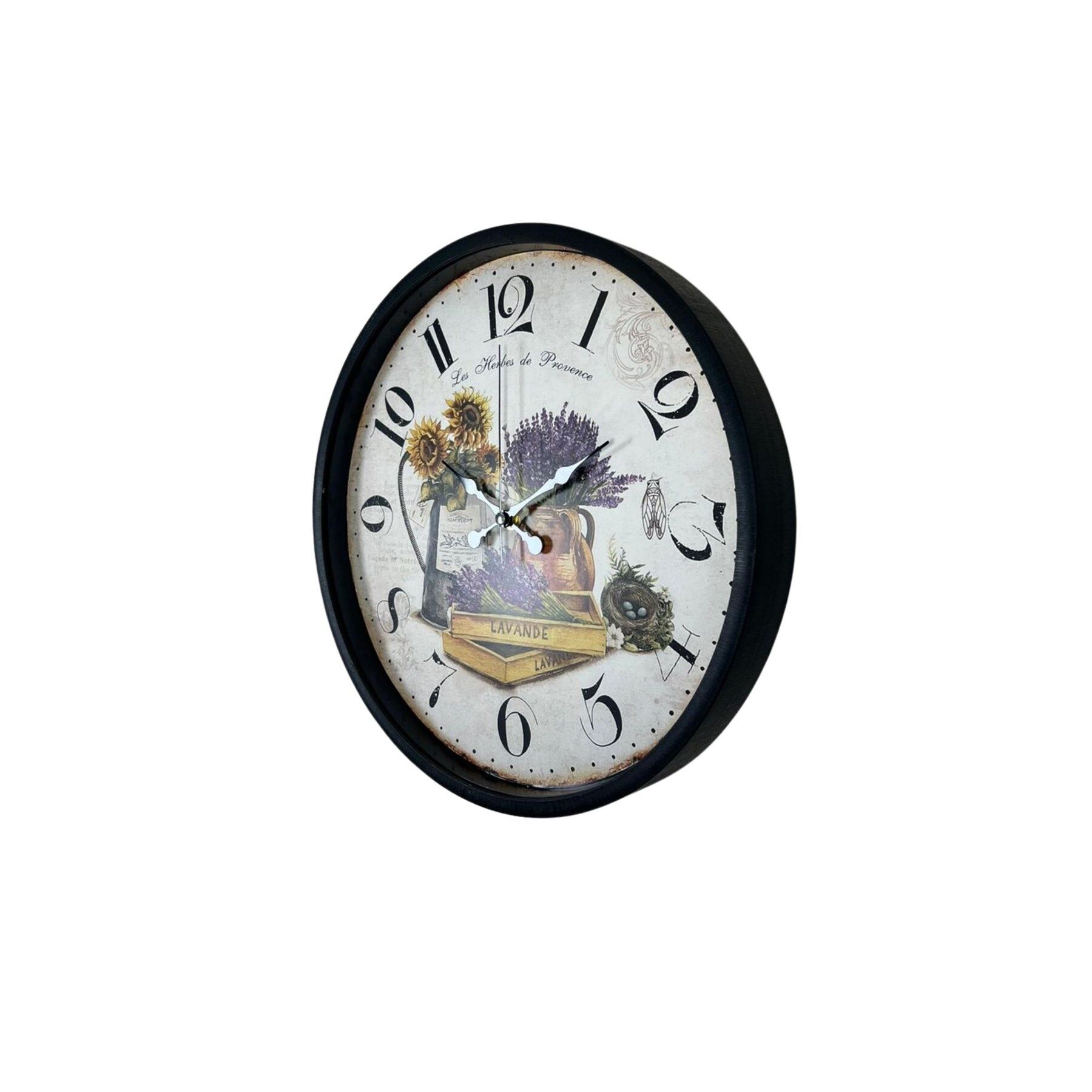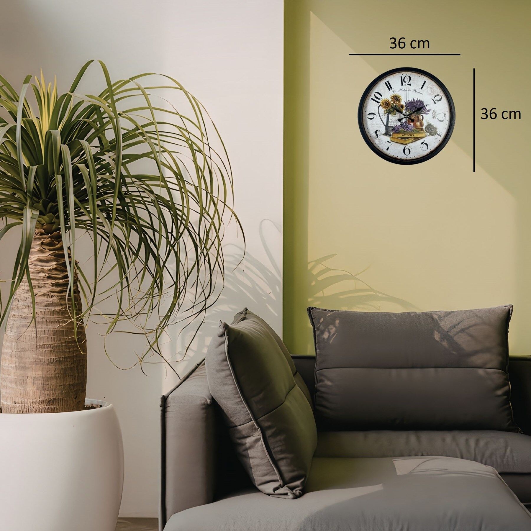 Evinizin dekorasyonuna sıcak ve nostaljik bir dokunuş katmak isteyenler için tasarlanmış 36 cm siyah duvar saati, Provence esintili lavanta ve ayçiçeği desenleriyle bulunduğu ortama doğal bir şıklık kazandırır. Vintage tarzı kadranı ve zarif rakam tasarımı sayesinde mutfak, salon, oturma odası ve kafe dekorasyonlarında dekoratif bir tamamlayıcıdır.