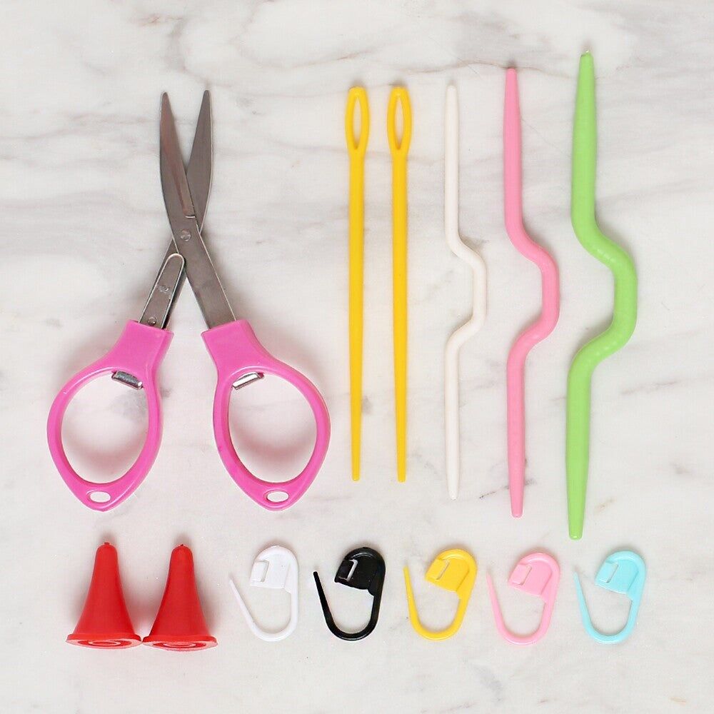 Loren Renkli Metal Yün tığlarının yanı sıra içerisinde örgü ile ilgili birçok aksesuarlarda bulunur. Kolayca taşınabilirdir.