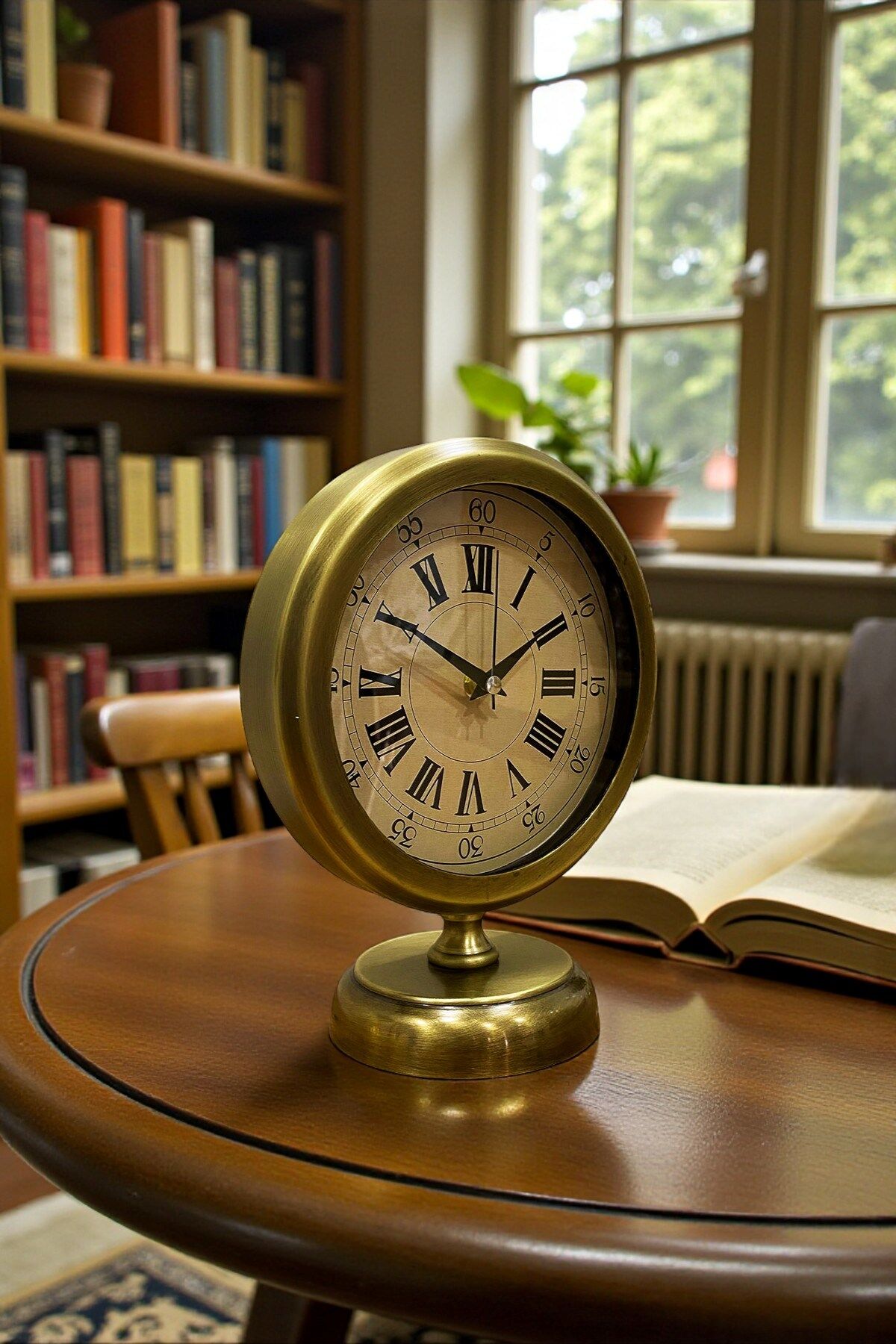 Klasik saat tasarımının en zarif örneklerinden biri olan bu eskitme vintage masa saati, Roma rakamlı kadranı ve pirinç tonlu metal gövdesiyle zamansız bir şıklık sunar. Nostaljik detayları modern yaşam alanlarıyla buluşturan bu model, bulunduğu ortamda güçlü ve asil bir dekoratif etki yaratır.