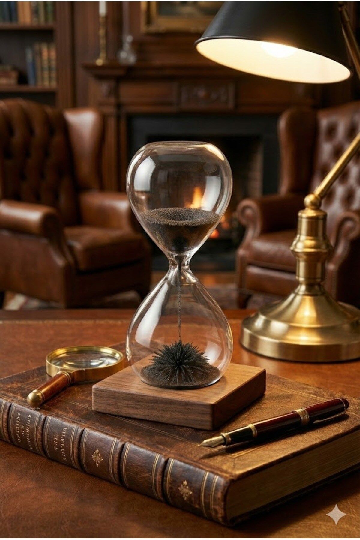 Manyetik Kum Saati Mıknatıslı Ahşap Standlı Dekoratif Masaüstü Hediyelik Süs Eşyası (14 cm)