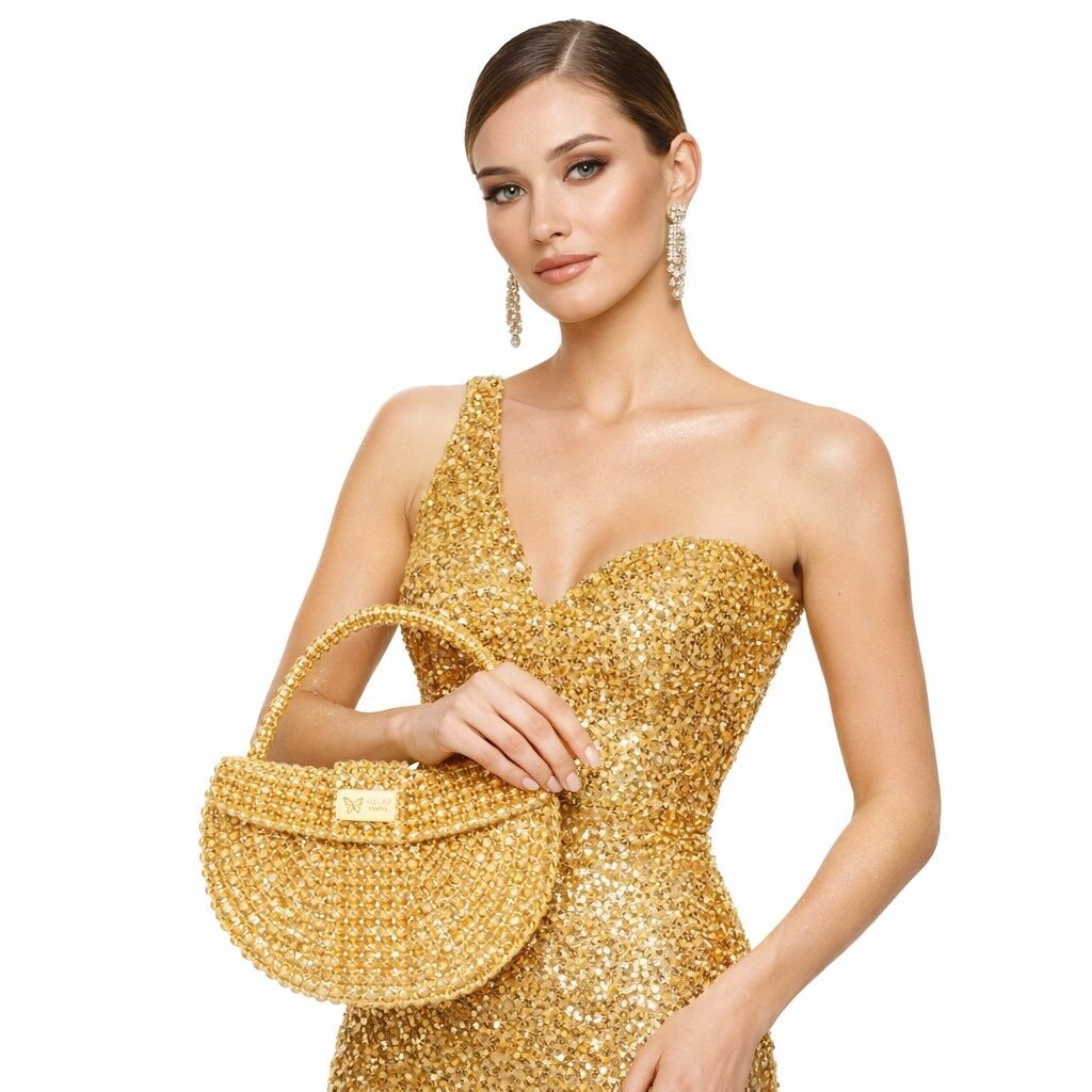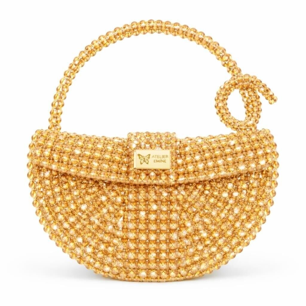 Atelier Emine’in Crystal Gelato Couture serisine ait Melo Caramello, 8 mm optik sınıfı kristal boncukların yüksek dayanımlı misina ile örülmesiyle tamamen el işçiliğiyle üretilmiş, yarım ay formunda premium mini çanta modelidir.