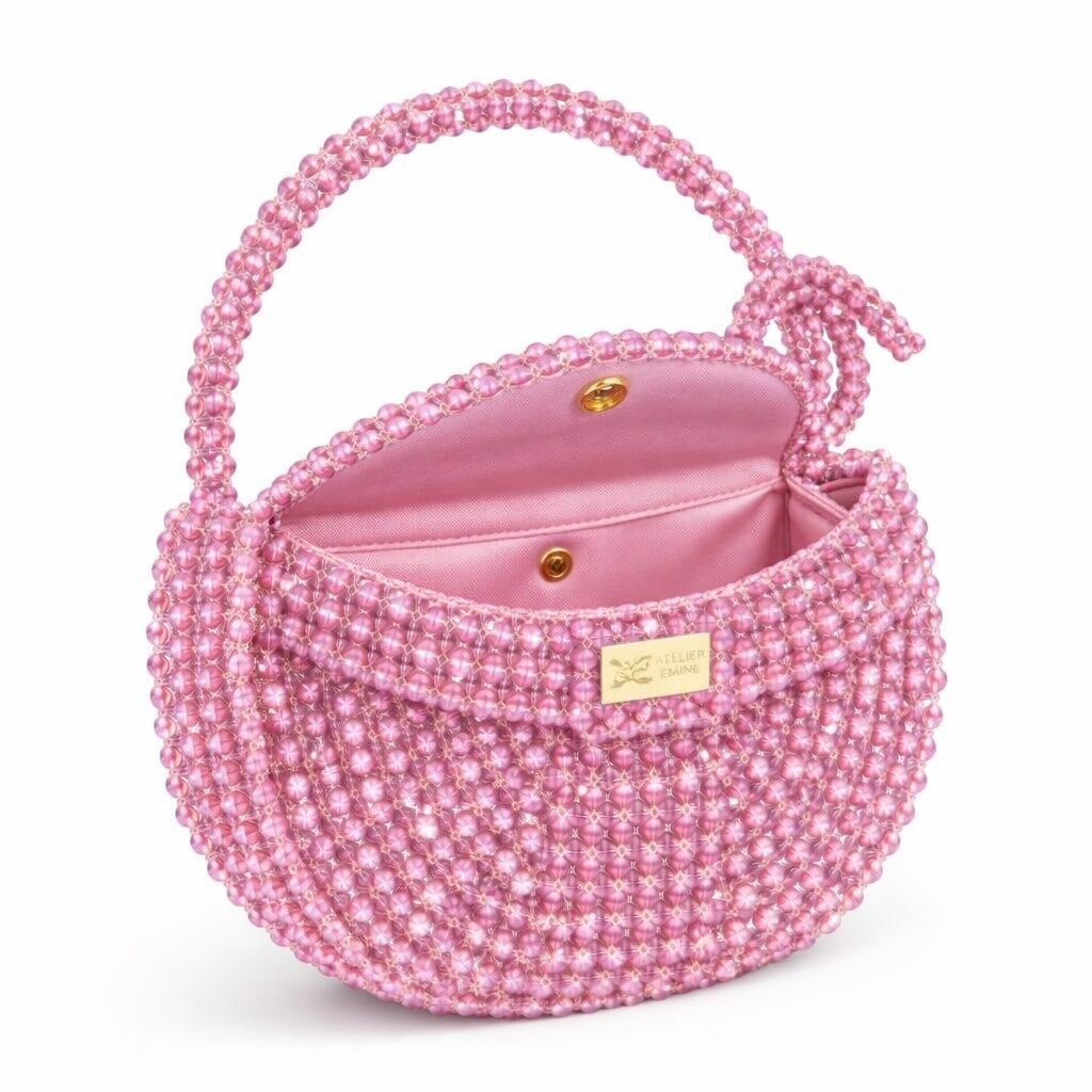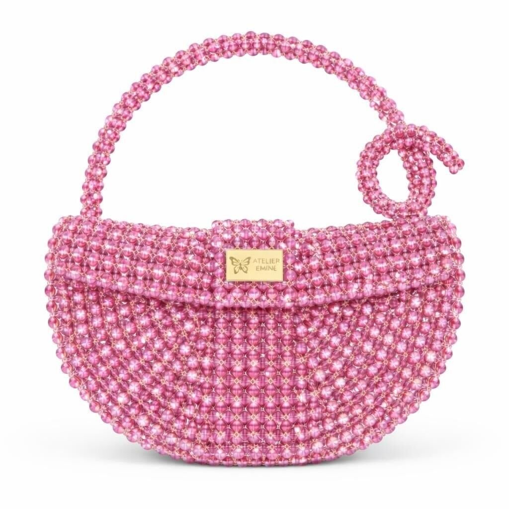Atelier Emine’in Crystal Gelato Couture serisine ait Melo Cotton, 8 mm optik sınıfı kristal boncukların yüksek dayanımlı misina ile örülmesiyle tamamen el işçiliğiyle üretilmiş, yarım ay formunda premium mini çanta modelidir.
