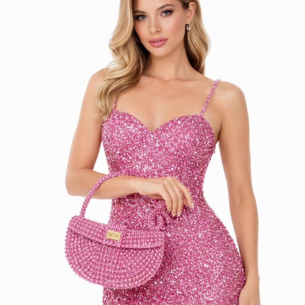 Kristal boncuklar, yüzeyde yüksek ışık kırılımı ve derinlik etkisi oluşturacak şekilde yoğun ve simetrik bir örgü düzeniyle tek tek işlenmiştir. Gövde, yarım daire formunda yapılandırılarak hem estetik akış hem de yapısal denge sağlanmıştır.