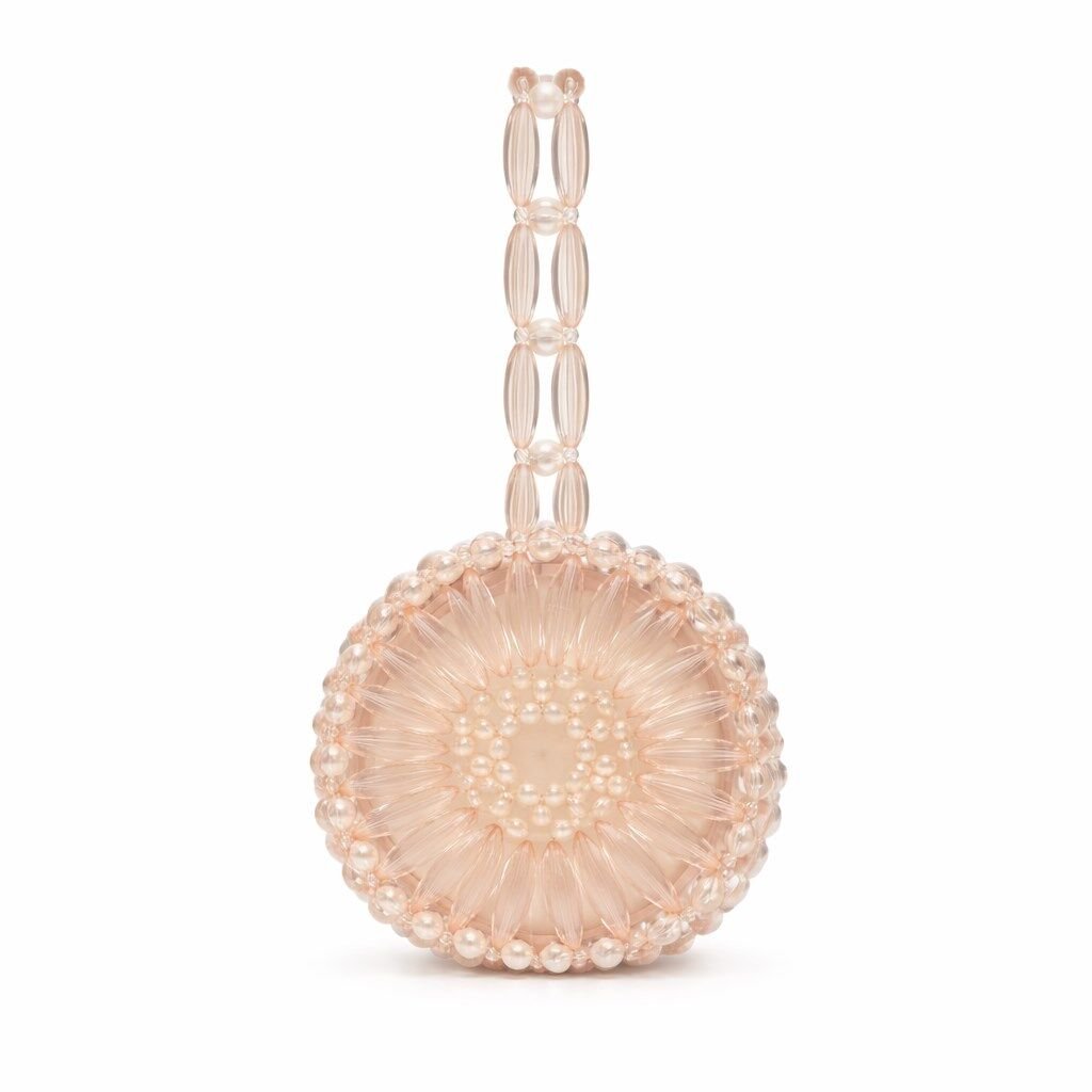 Atelier Emine’in Crystal Gelato Couture koleksiyonuna ait Melo Dawn, merkezden çevreye doğru katmanlanan dairesel örgü kompozisyonu ve dikey eksende yükselen kulp mimarisiyle tasarlanmış, heykelsi karaktere sahip premium el yapımı kristal mini çanta modelidir.