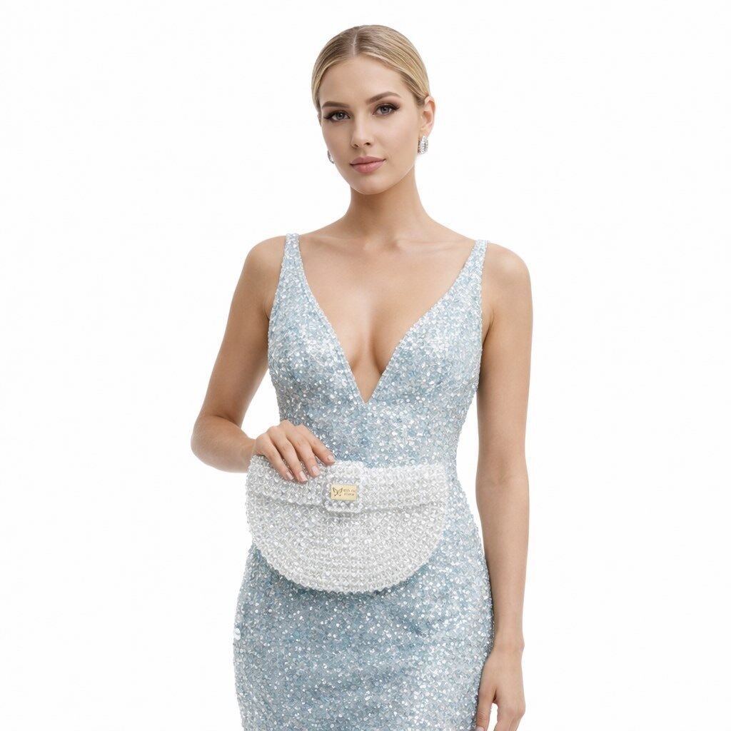 Atelier Emine’in Crystal Gelato Couture serisine ait Melo Pearl, 8 mm optik sınıfı kristal boncukların yüksek dayanımlı misina ile örülmesiyle tamamen el işçiliğiyle üretilmiş, yarım ay formunda premium mini çanta modelidir.