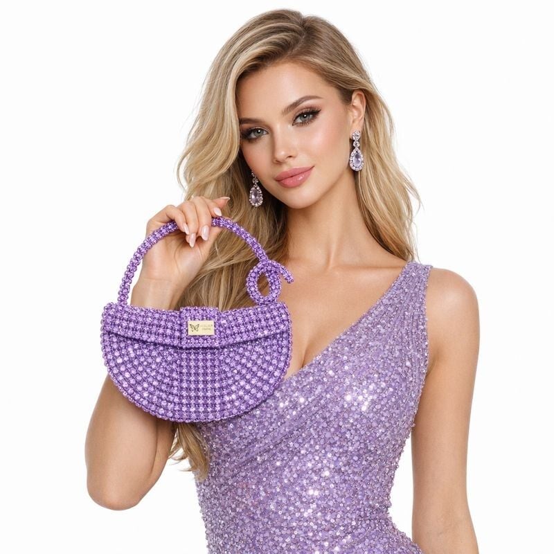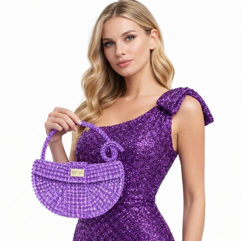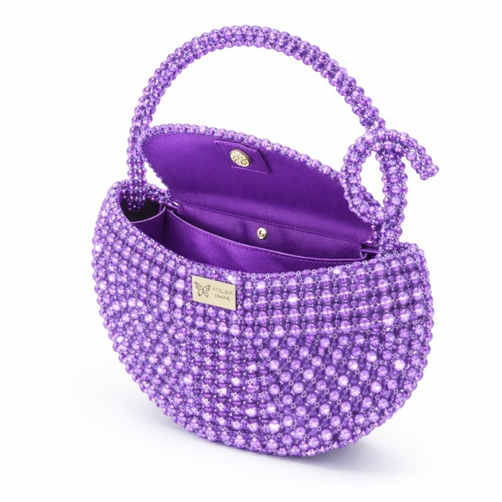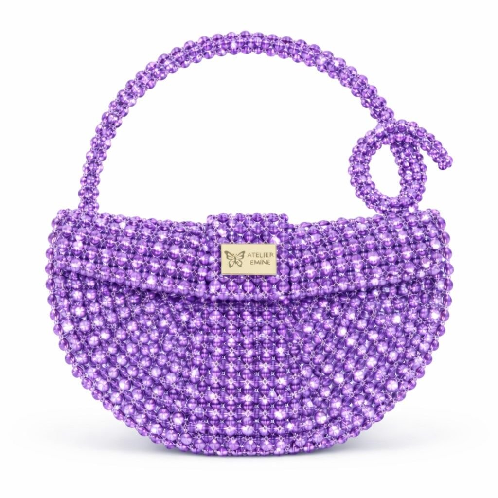 Atelier Emine’in Crystal Gelato Couture serisine ait Melo Viola, 8 mm optik sınıfı kristal boncukların yüksek dayanımlı misina ile örülmesiyle tamamen el işçiliğiyle üretilmiş, yarım ay formunda premium mini çanta modelidir.