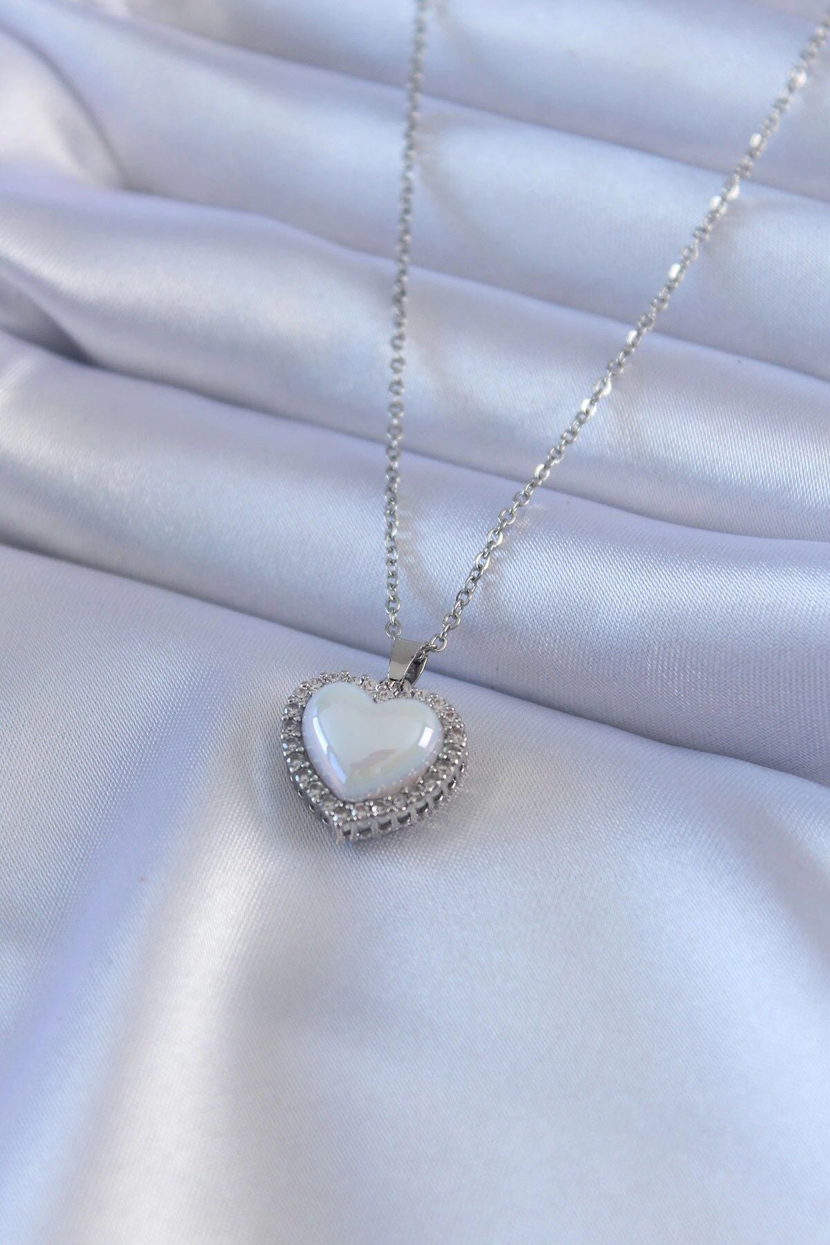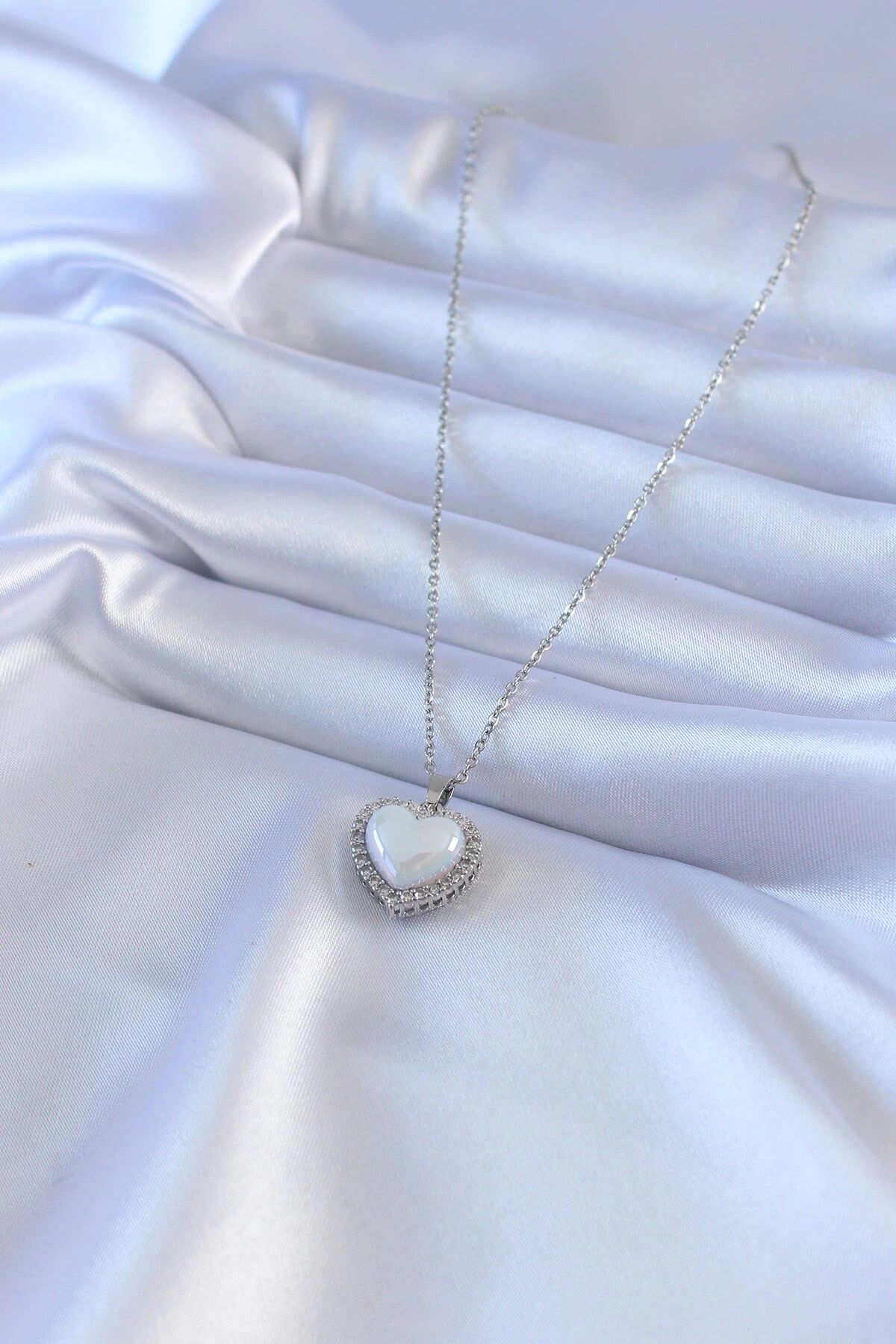 Mey İthalat® 316L Çelik Gümüş Renk İncili Kalp Model Zirkon Taşlı Kadın Kolye