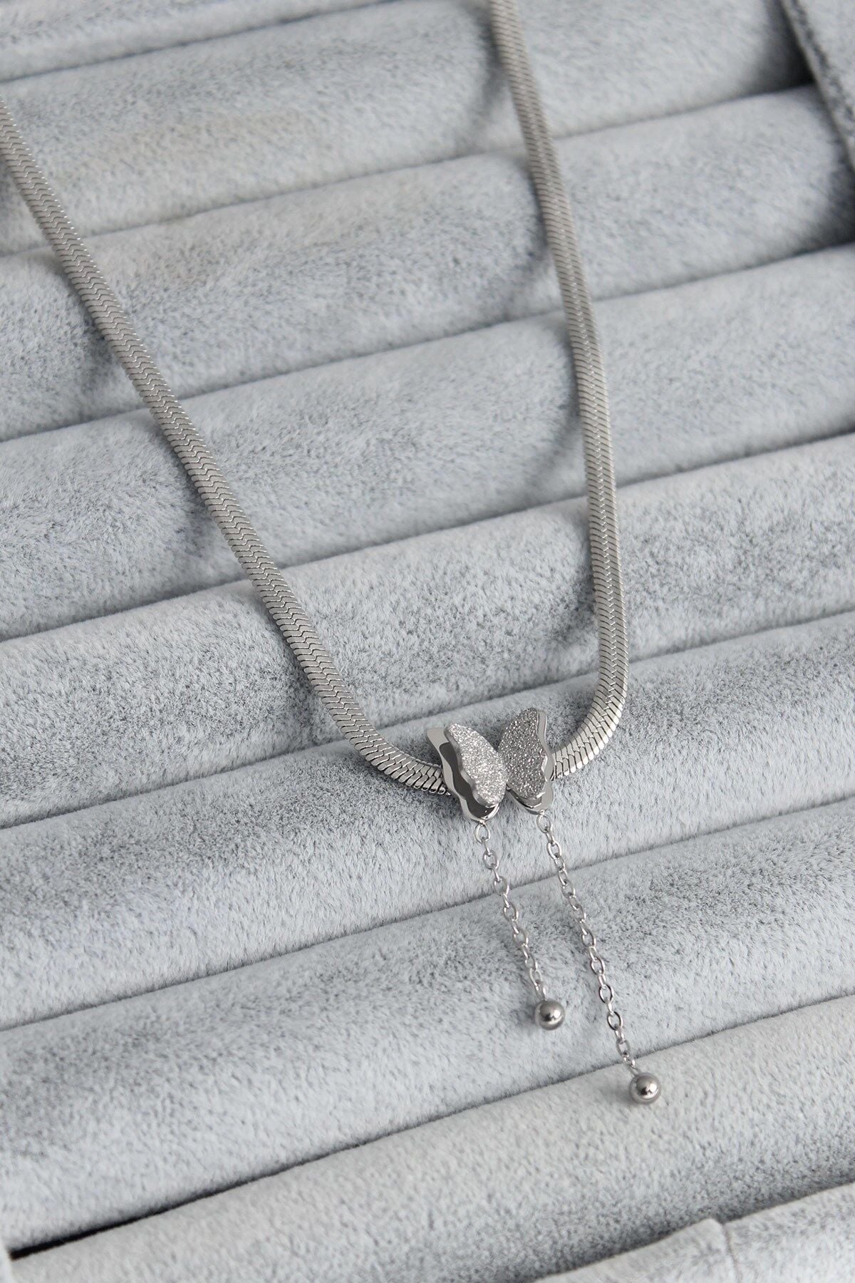 Mey İthalat® 316L Çelik Gümüş Renk İtalyan Zincir Model Simli Kelebek Figür Kadın Kolye