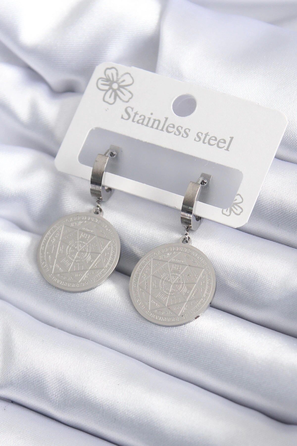 Mey İthalat® 316L Çelik Gümüş Renk Pentagram İşleme Model Kadın Küpe