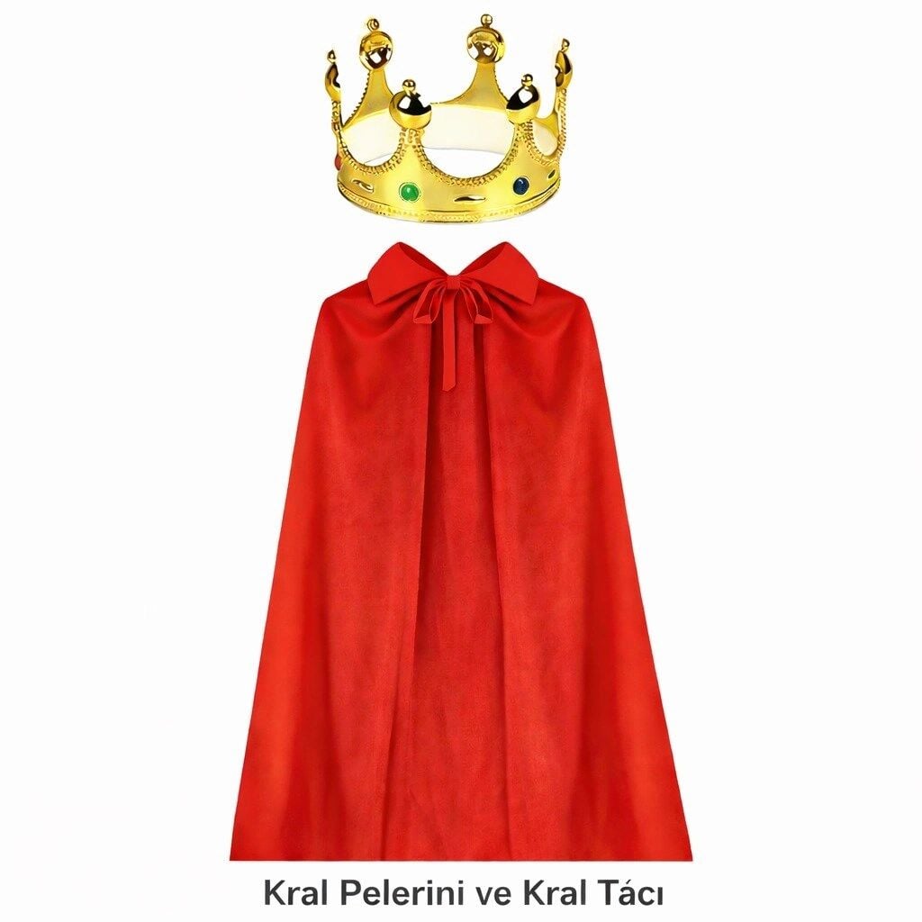 Kırmızı kral pelerini ise yaklaşık 90 cm uzunluğunda olup canlı rengi ve akıcı görünümü ile kostüme etkileyici bir hava katar. Boyun kısmındaki bağlama detayı sayesinde kolayca takılıp çıkarılabilir.