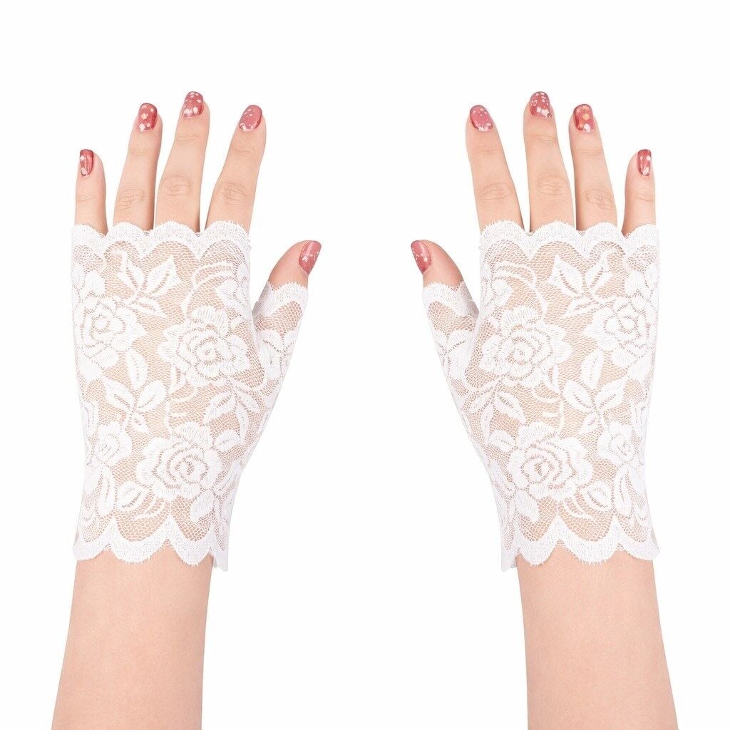 Zarif ve estetik tasarımıyla öne çıkan beyaz gül desenli dantel parmaksız eldiven, şık kombinler ve özel etkinlikler için ideal bir aksesuardır. İnce dantel dokusu ve gül desenli tasarımı ürüne zarif bir görünüm kazandırır.