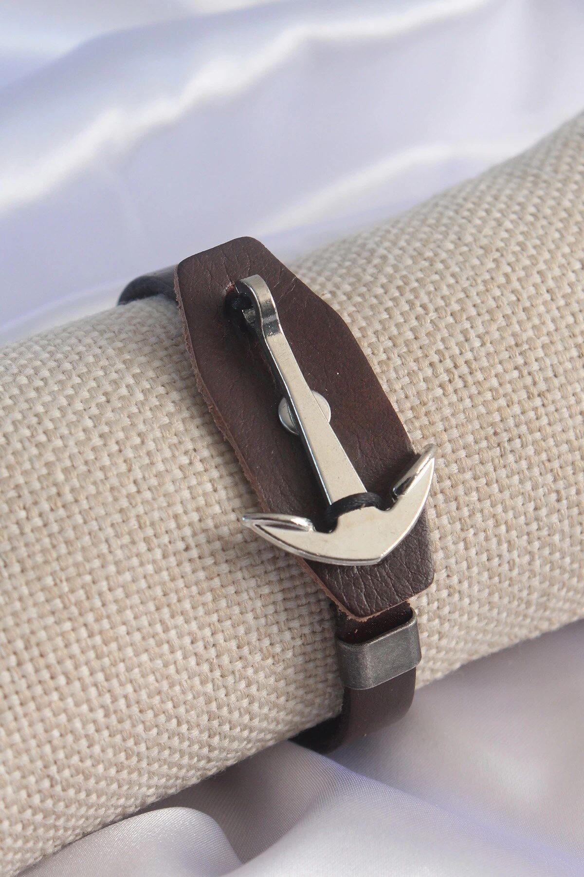 Mey İthalat® Kahverengi Deri Model Gümüş Renk Çapa Figür Erkek Bileklik