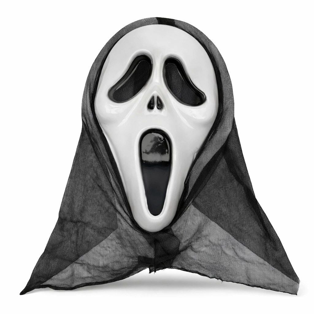 - Beyaz hayalet görünümü ve siyah kapüşonu ile Scream filminden ikonik karaktere benzeyen bir maskeye sahip olun.