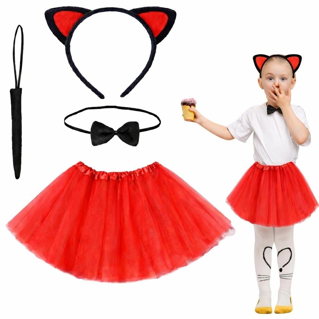 Canlı kırmızı renk tütü etek, yumuşak dokulu kedi kulak tacı, papyon ve kedi kuyruğu ile tam bir kombin oluşturur.