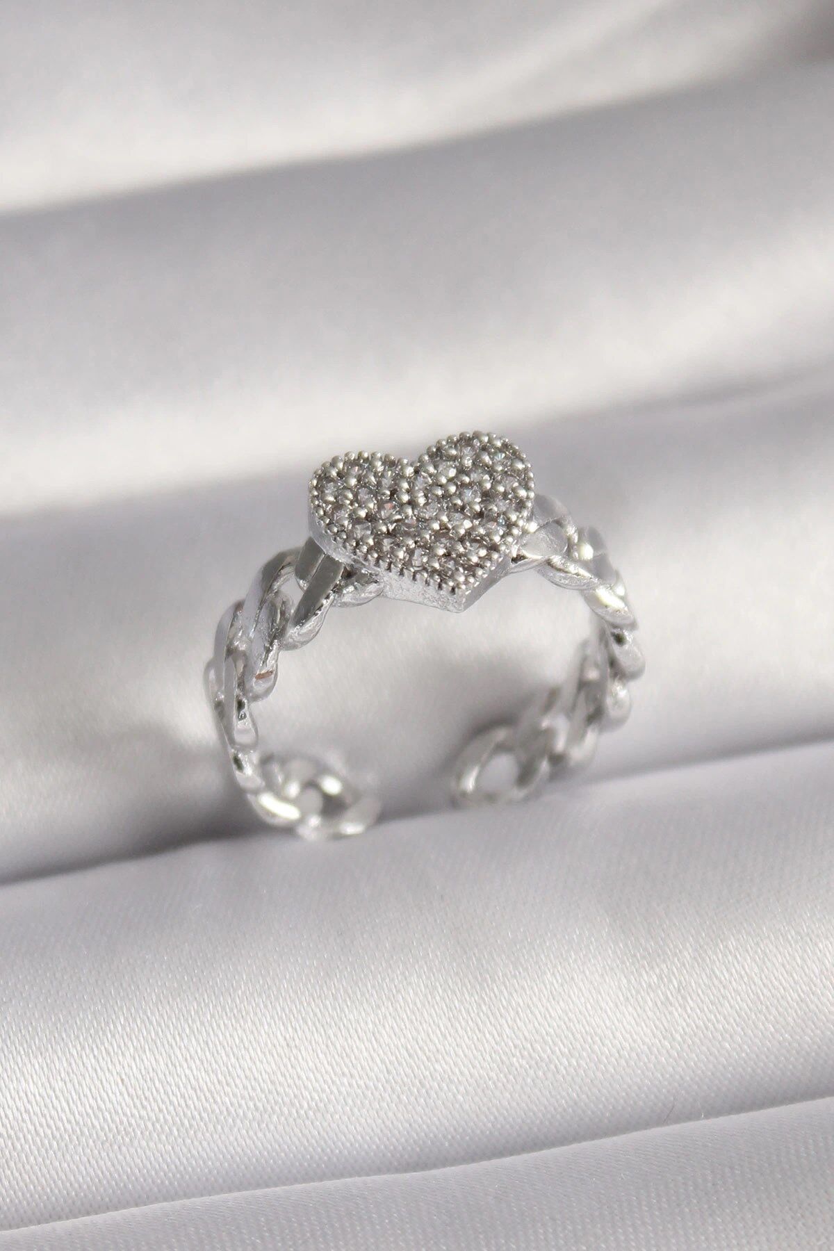 Mey İthalat® Pirinç Gümüş Renk Zirkon Taşlı Kalp Model Kadın Yüzük