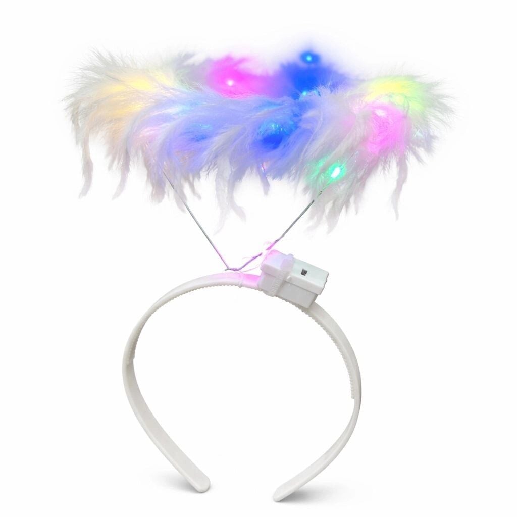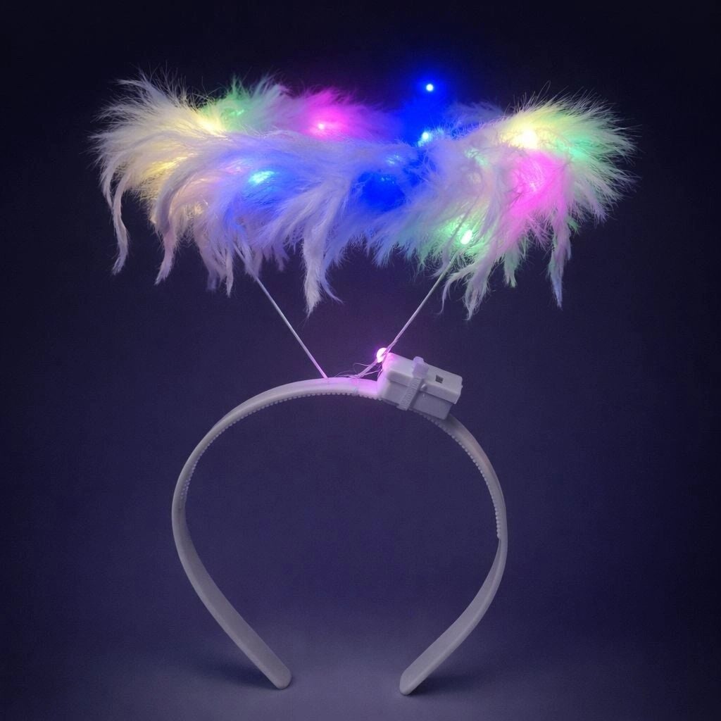 Renkli LED ışıkları ve zarif tüylü püskülleri ile tasarlanan bu ışıklı taç, parti ve eğlence ortamlarının en dikkat çekici aksesuarlarından biridir. Baş kısmında bulunan hafif ve esnek taç yapısı sayesinde rahat bir kullanım sunar.