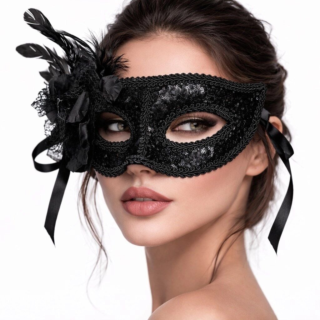 Mey İthalat® Siyah Venedik Parti Maskesi – Çiçekli Tüylü Payetli
