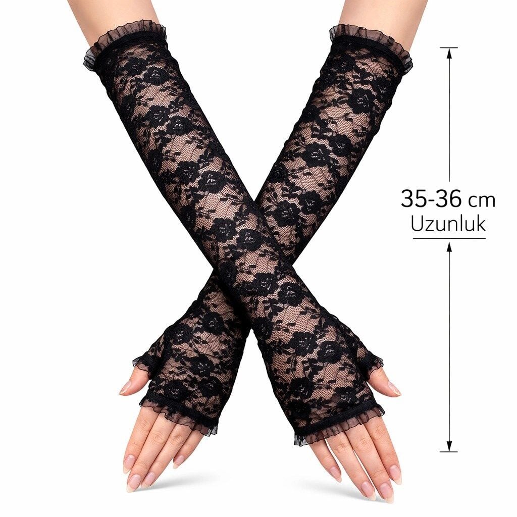 35-36 cm uzunluğa sahip olan bu özel tasarım eldiven, kol boyunca şık bir duruş sağlar. Parmaksız yapısı sayesinde rahat kullanım sunarken, detaylı dantel işçiliği ile göz alıcı bir stil oluşturur.