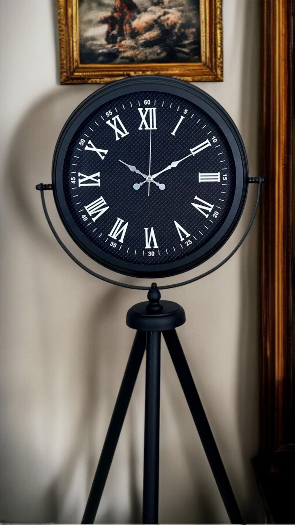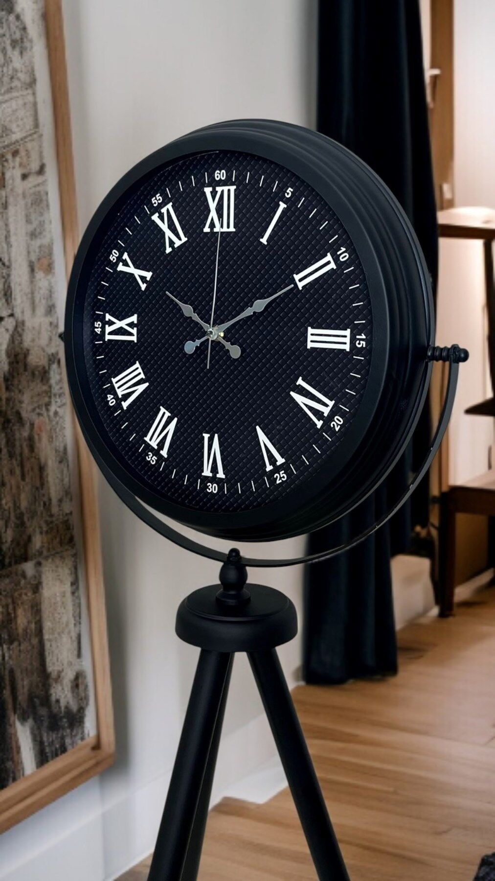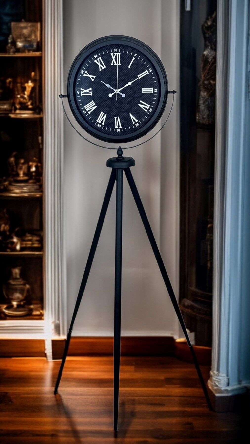Bulunduğu ortama güçlü bir karakter ve premium bir şıklık kazandıran Siyah Tripod Ayaklı Dekoratif Salon Saati, 150 x 45 cm ölçüsüyle geniş yaşam alanlarında dikkat çeken bir dekor parçasıdır. Siyah metal tripod ayak tasarımı modern, loft ve endüstriyel dekorasyonlara kusursuz uyum sağlarken; siyah kadran üzerindeki Roma rakamları saate zamansız ve seçkin bir görünüm kazandırır. Bu özel tasarım sadece zamanı göstermekle kalmaz; salonun şık bir köşesinde, antre girişinde, ofis resepsiyonunda veya mağaza vitrininde “vitrin etkisi” yaratarak dekorun odak noktası olur.