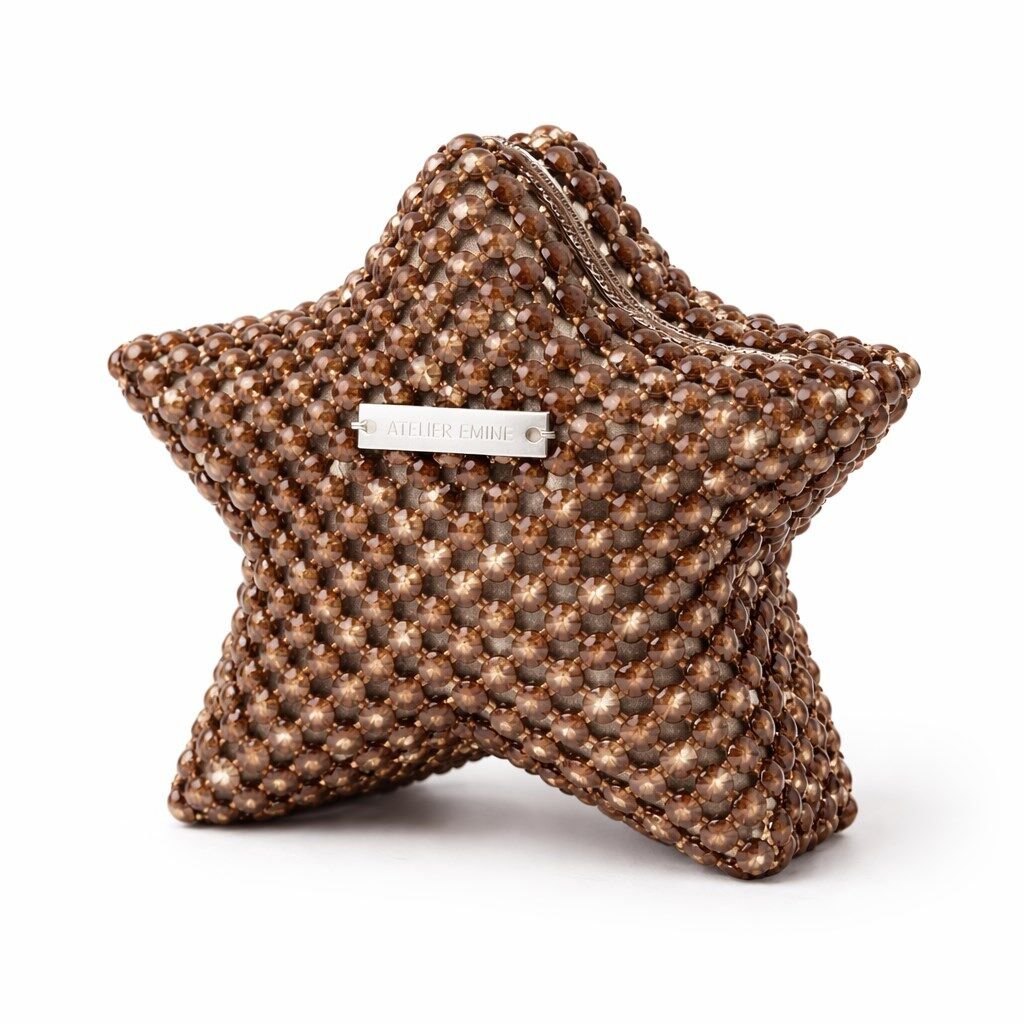 Atelier Emine’in Crystal Gelato Couture serisine ait Mielo Castagna, üç boyutlu yıldız formu esas alınarak tasarlanmış; 8 mm optik sınıfı kristal boncukların yüksek dayanımlı misina ile tek tek örülmesiyle üretilmiş, heykelsi nitelik taşıyan premium mini clutch modelidir.