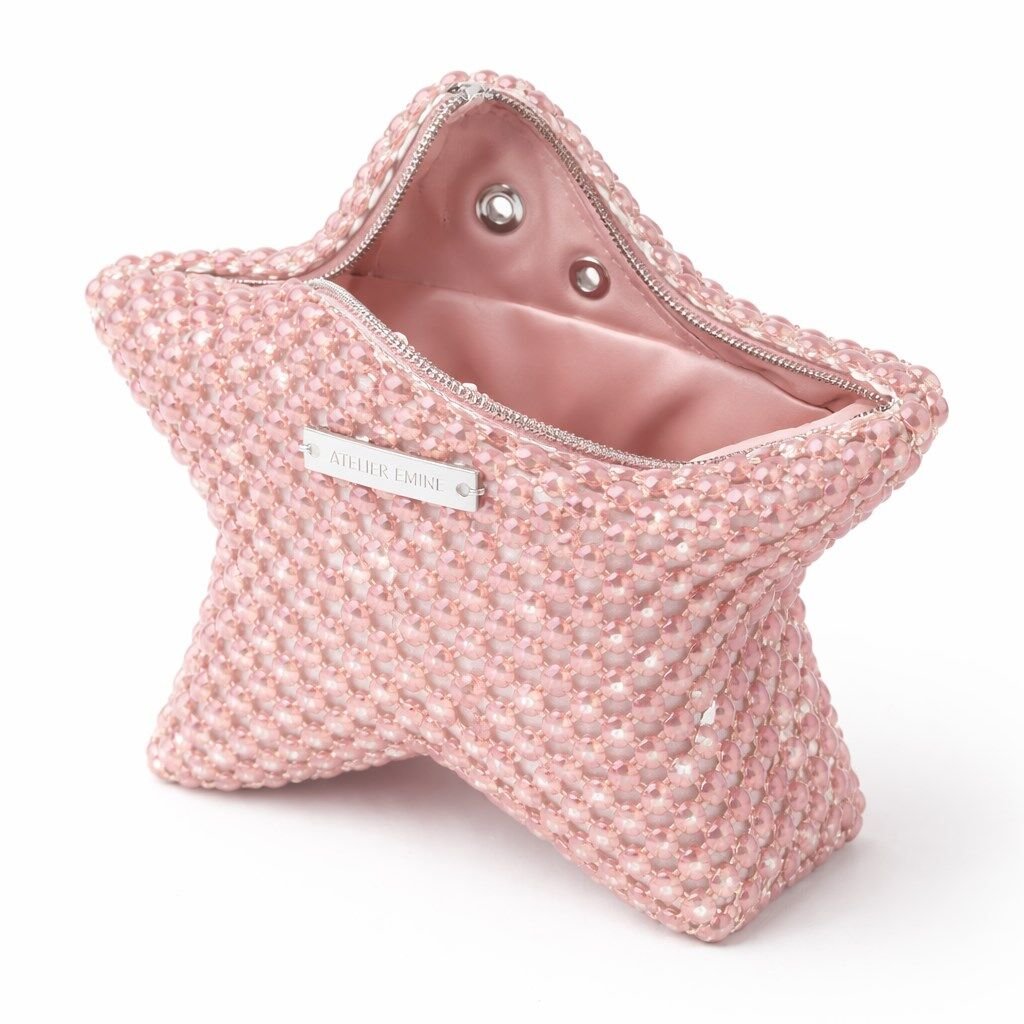 Atelier Emine’in Crystal Gelato Couture serisine ait Mielo Confetto, üç boyutlu yıldız formu esas alınarak tasarlanmış; 8 mm optik sınıfı kristal boncukların yüksek dayanımlı misina ile tek tek örülmesiyle üretilmiş, heykelsi nitelik taşıyan premium mini clutch modelidir.