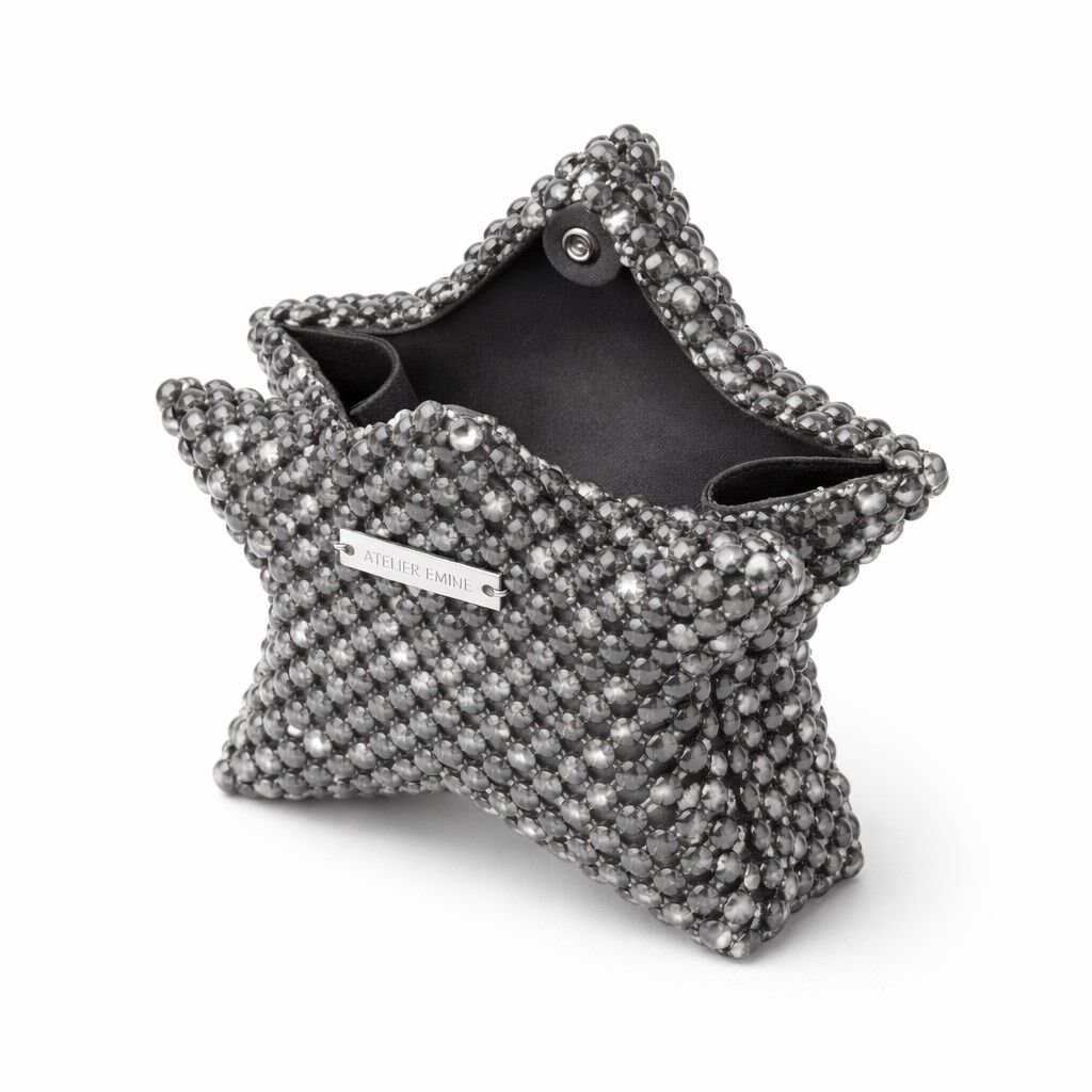 Atelier Emine’in Crystal Gelato Couture serisine ait Mielo Luna, üç boyutlu yıldız formu esas alınarak tasarlanmış; 8 mm optik sınıfı kristal boncukların yüksek dayanımlı misina ile tek tek örülmesiyle üretilmiş, heykelsi nitelik taşıyan premium mini clutch modelidir.
