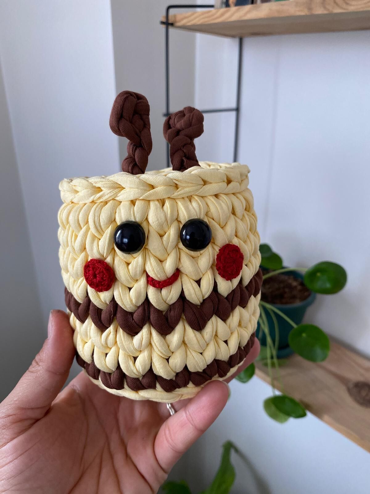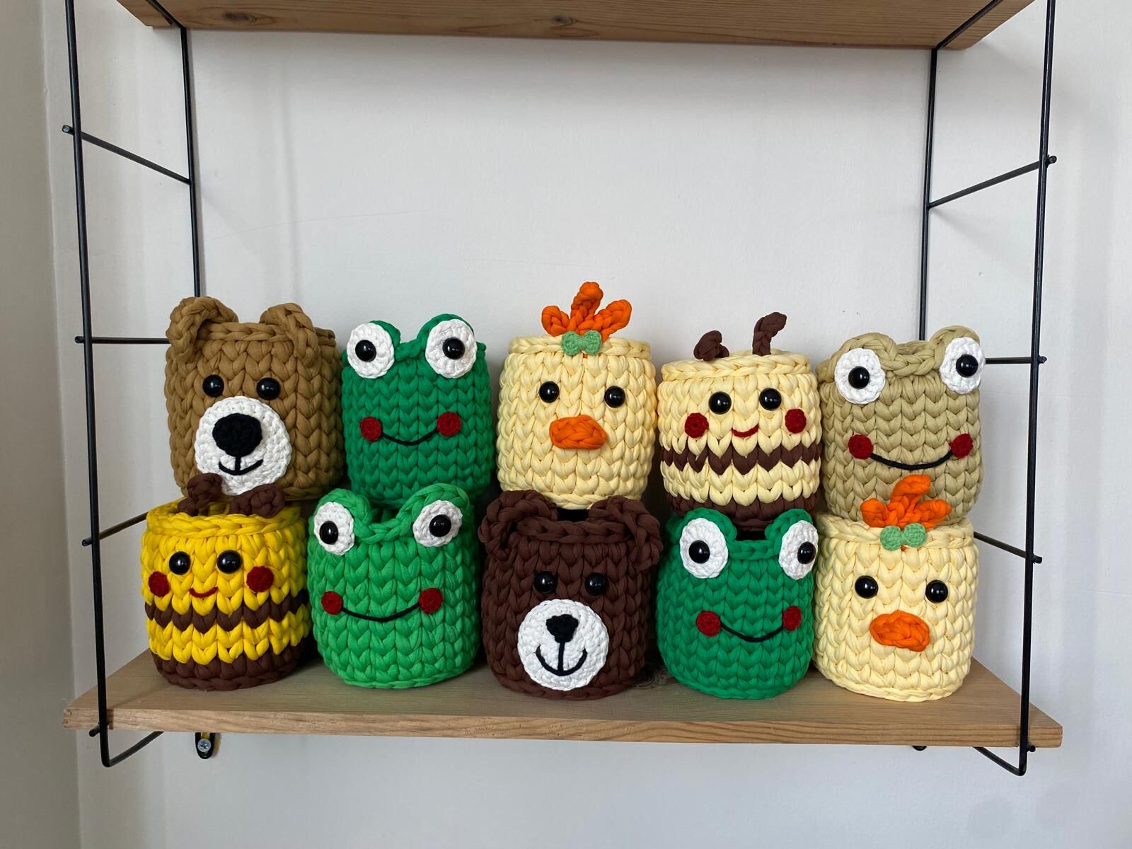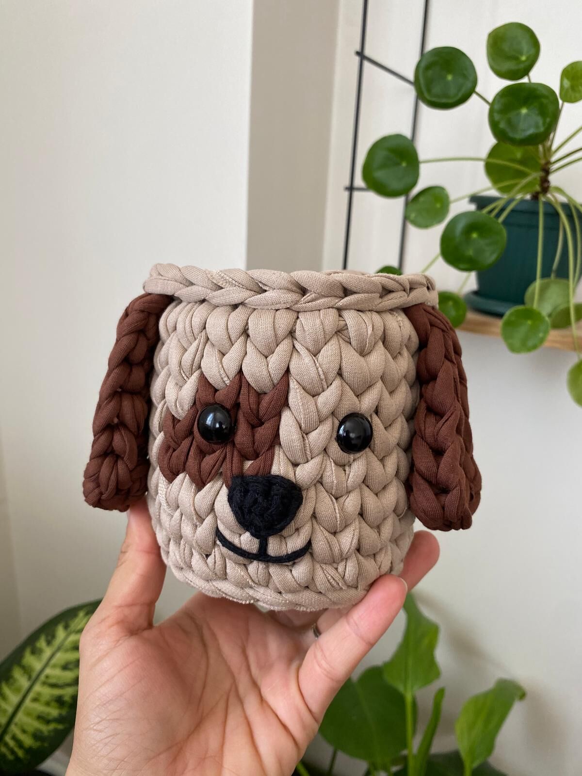 Mini Köpek Yüzlü El Örgüsü Kalemlik – Penye İp Sepet Organizer (10–12 cm)
