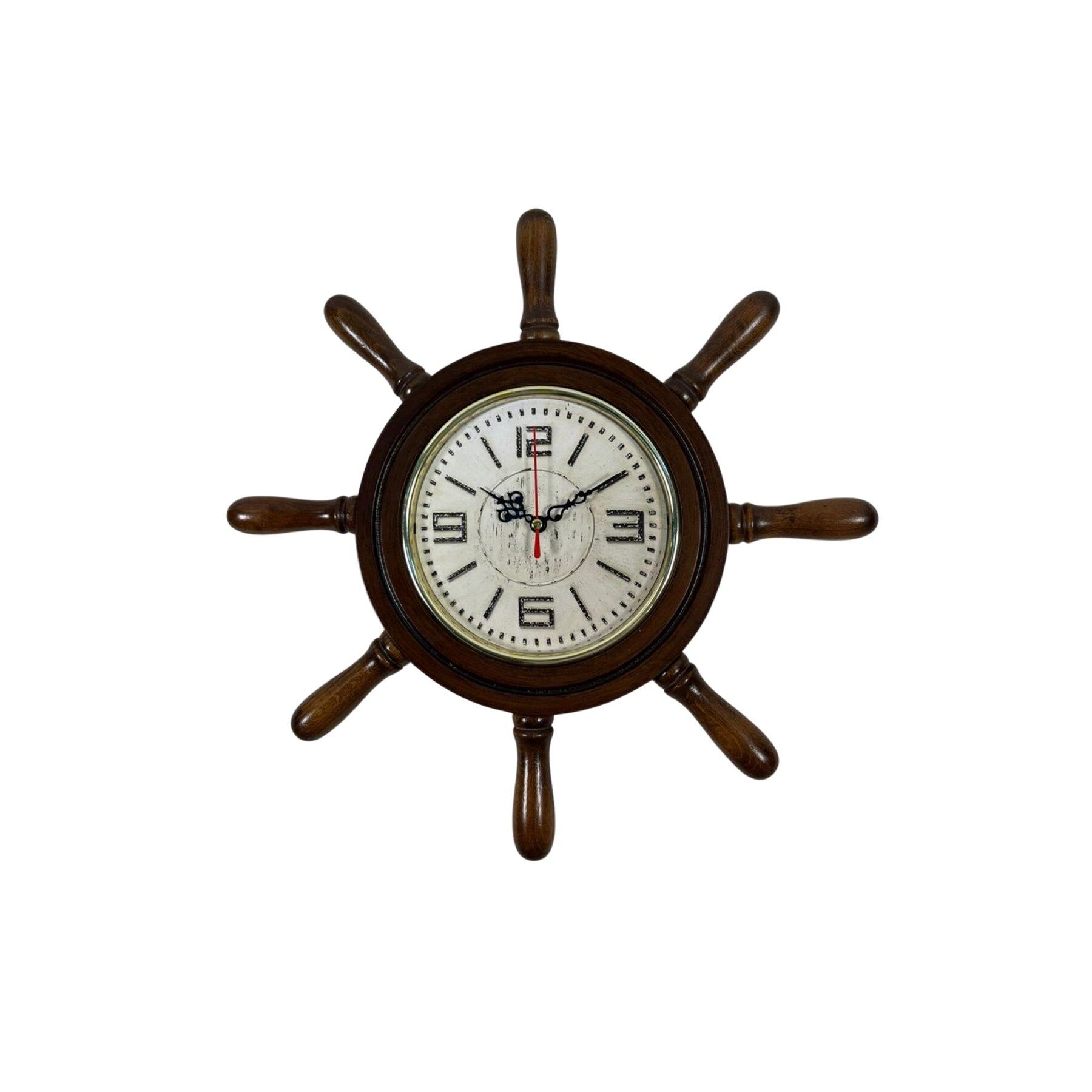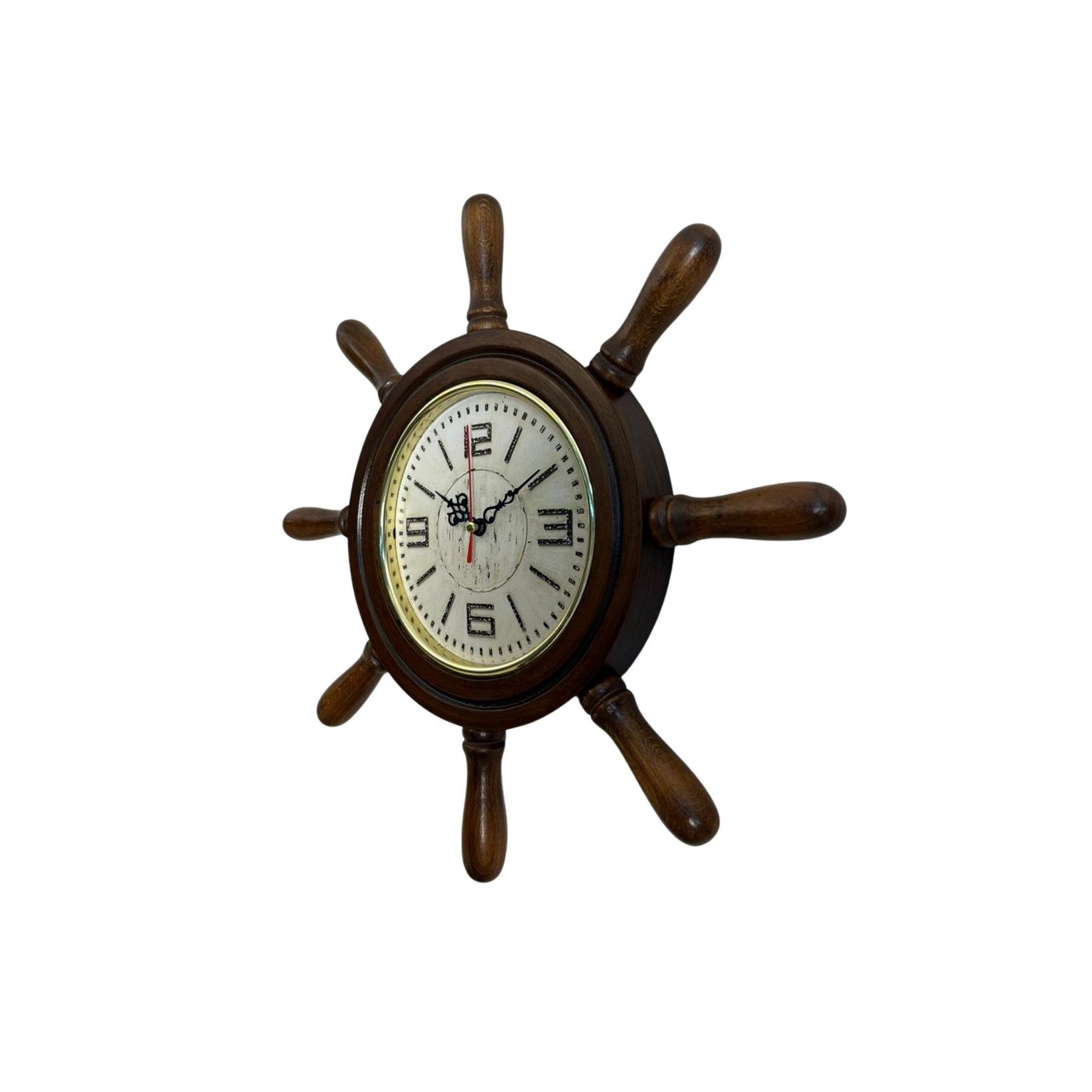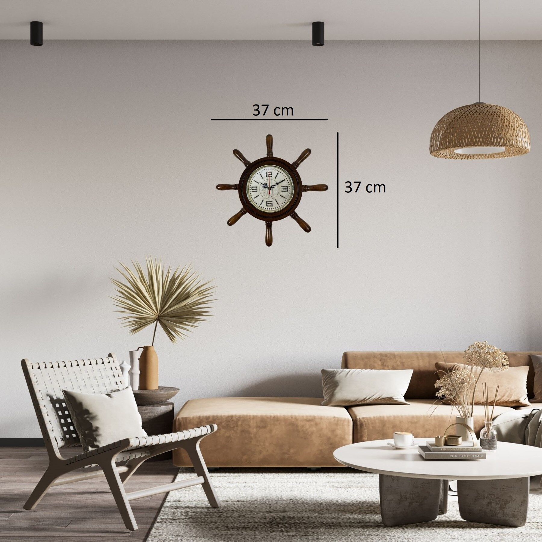 Saatin etrafında bulunan dümen kolları (kavelalar), gerçek bir gemi dümenini andıran detaylı bir tasarıma sahiptir. Bu kavelalar 8 cm uzunluğunda olup saatin marin karakterini güçlendiren estetik bir görünüm sunar. Saat kısmının çapı ise 37 cm olup duvar üzerinde dengeli ve dikkat çekici bir ölçü sunar.