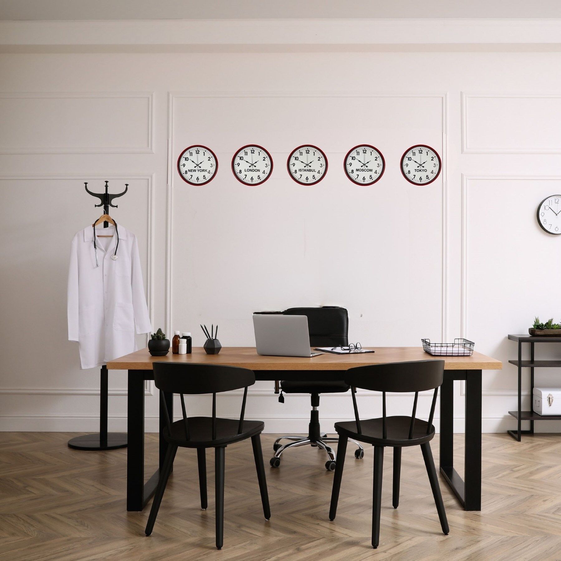 New York, London, Istanbul, Moscow ve Tokyo şehirlerinin saatlerini aynı anda takip etmenizi sağlayan bu özel set; oteller, resepsiyonlar, ofisler ve uluslararası çalışan işletmeler için hem dekoratif hem de işlevsel bir çözümdür.