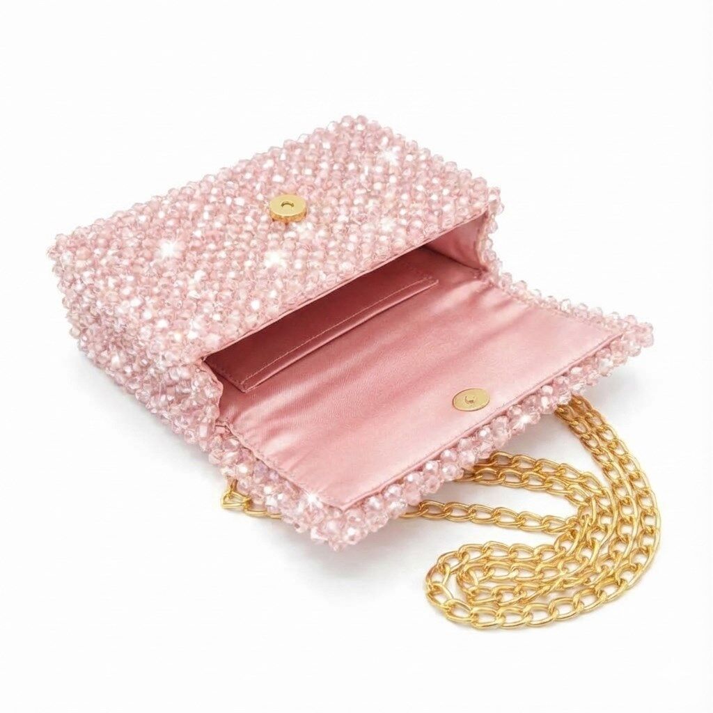Atelier Emine’in Crystal Gelato Couture serisine ait Panna Fuchsia, 8 mm optik sınıfı kristal boncuklar, metal omuz zinciri ve saten astar kullanılarak tamamen el işçiliğiyle üretilmiş premium clutch modelidir.