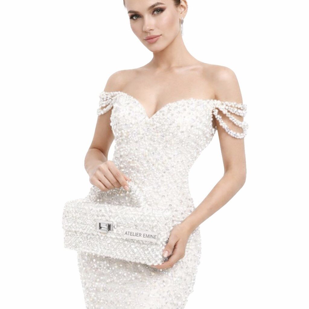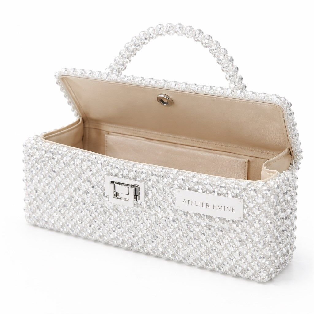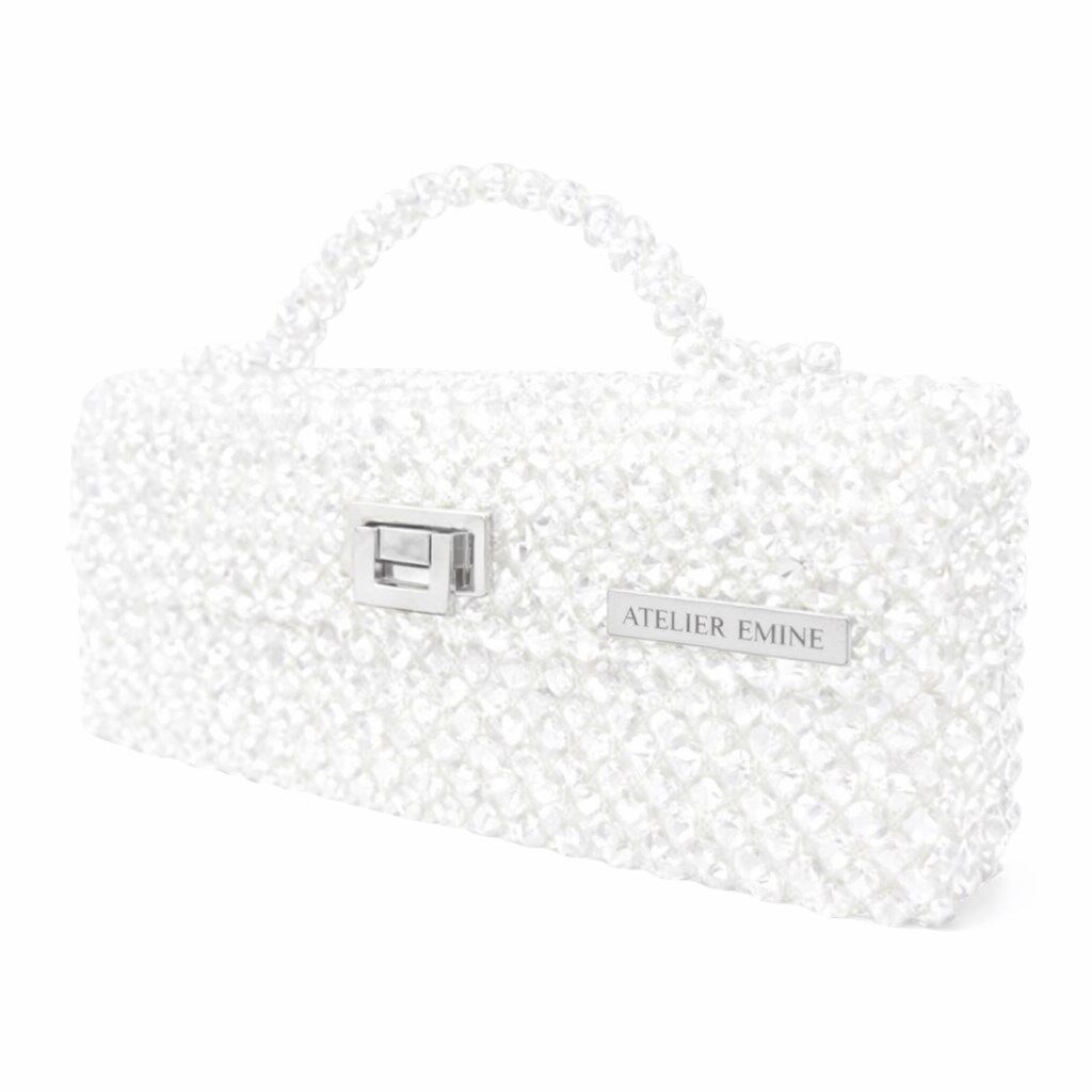 Atelier Emine’in Crystal Gelato Couture serisine ait Panna Ivory, 8 mm optik sınıfı kristal boncuklar, üst taşıma kulpu, metal kilit mekanizması ve saten astar kullanılarak tamamen el işçiliğiyle üretilmiş premium top-handle clutch modelidir.