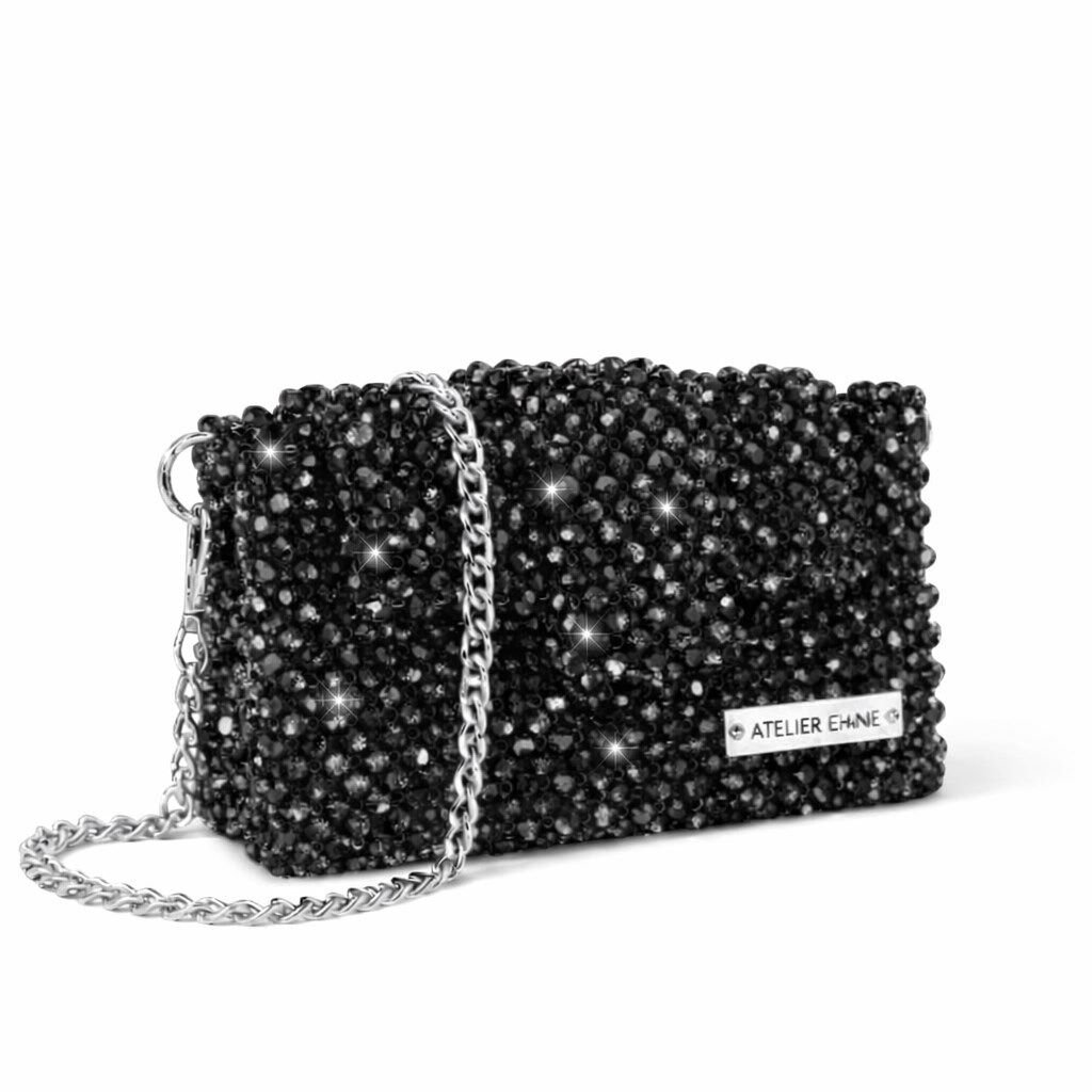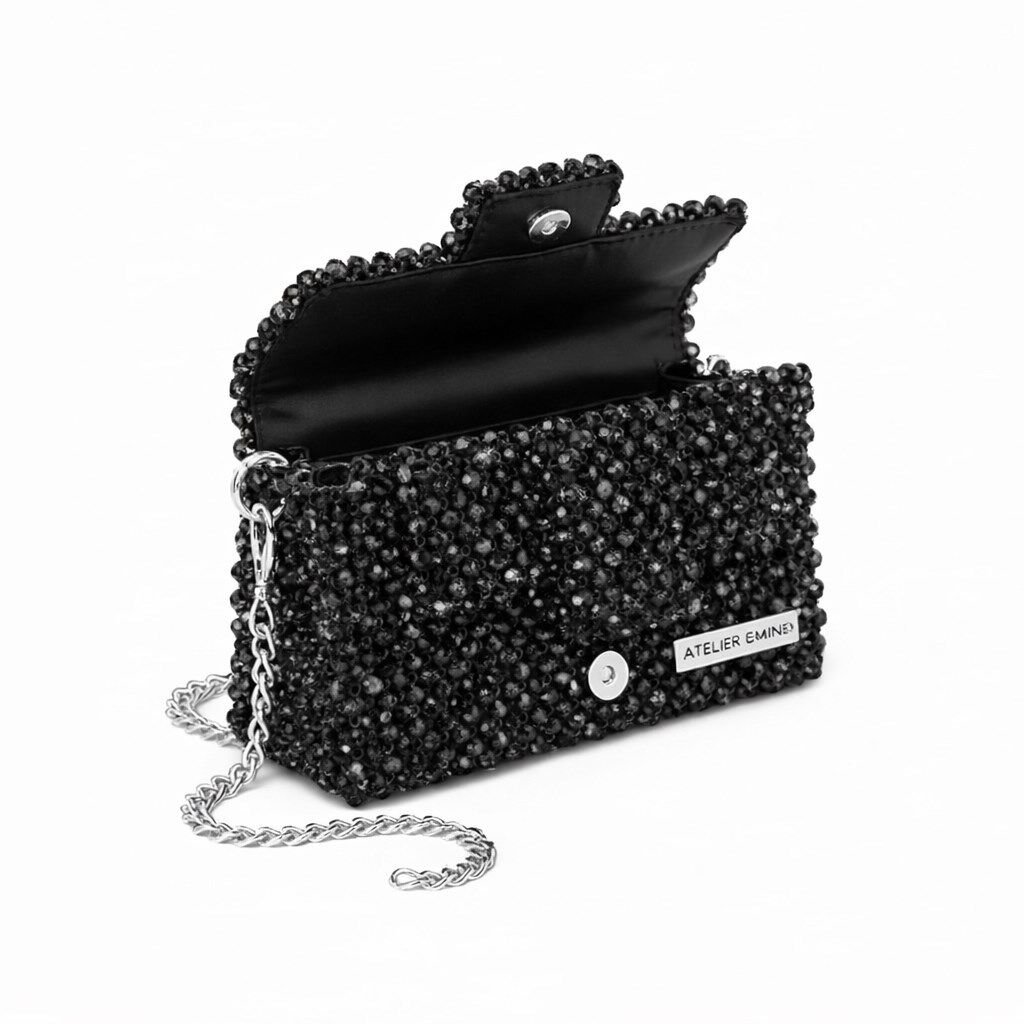 Atelier Emine’in Crystal Gelato Couture serisine ait Panna Jet, 8 mm optik sınıfı kristal boncuklar, metal omuz zinciri ve saten astar kullanılarak tamamen el işçiliğiyle üretilmiş premium clutch modelidir.