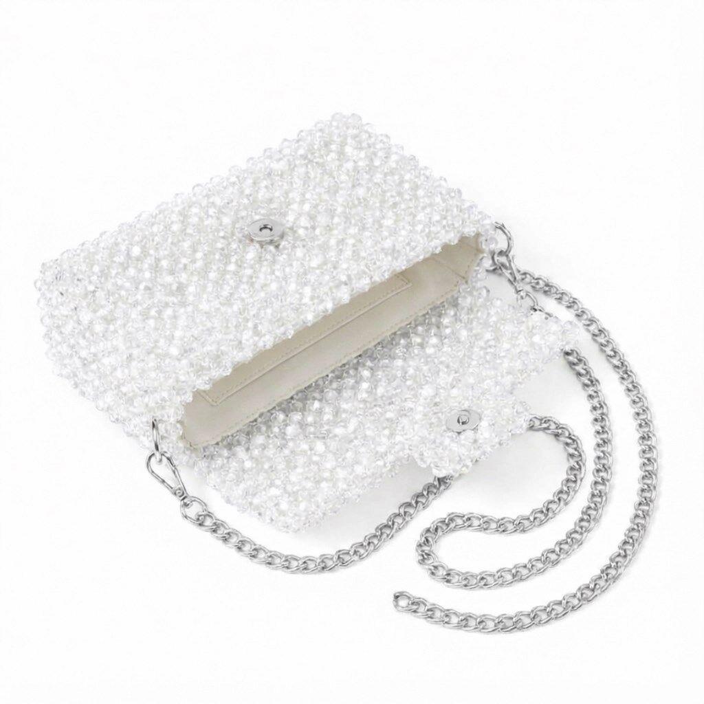 Atelier Emine’in Crystal Gelato Couture serisine ait Panna Marble, 8 mm optik sınıfı kristal boncuklar, metal omuz zinciri ve saten astar kullanılarak tamamen el işçiliğiyle üretilmiş premium clutch modelidir.