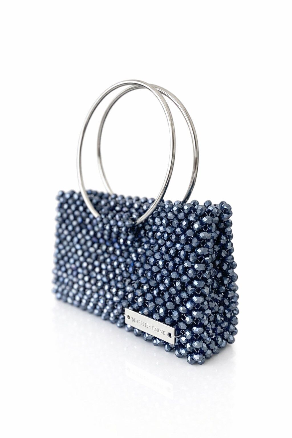 Atelier Emine’in Crystal Gelato Couture serisine ait Panna Ombra, 8 mm optik sınıfı kristal boncuklar, çift metal halka kulp ve saten astar kullanılarak tamamen el işçiliğiyle üretilmiş premium top-handle çanta modelidir.