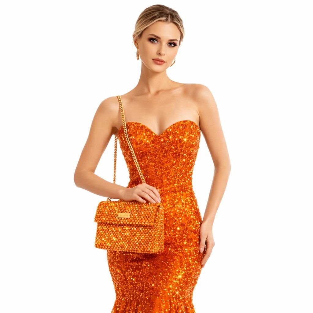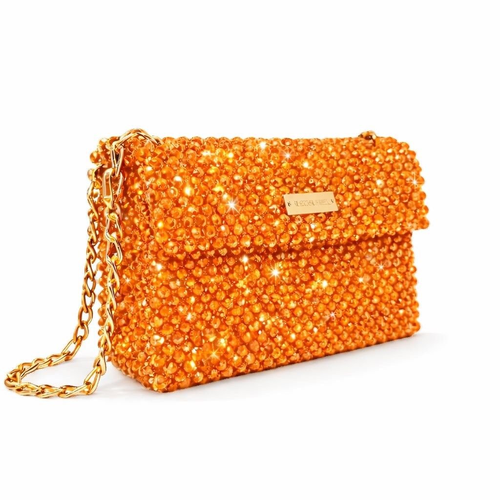 Atelier Emine’in Crystal Gelato Couture serisine ait Panna Papaya, 8 mm optik sınıfı kristal boncuklar, metal omuz zinciri ve saten astar kullanılarak tamamen el işçiliğiyle üretilmiş premium clutch modelidir.