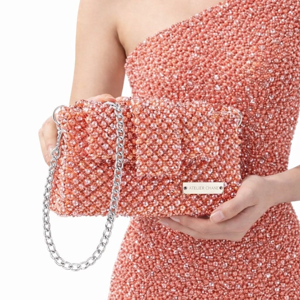 Atelier Emine’in Crystal Gelato Couture serisine ait Panna Petal, 8 mm optik sınıfı kristal boncuklar, metal omuz zinciri ve saten astar kullanılarak tamamen el işçiliğiyle üretilmiş premium clutch modelidir.