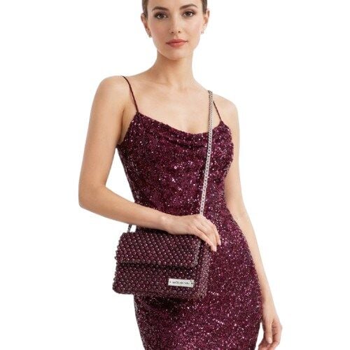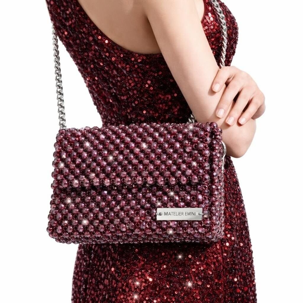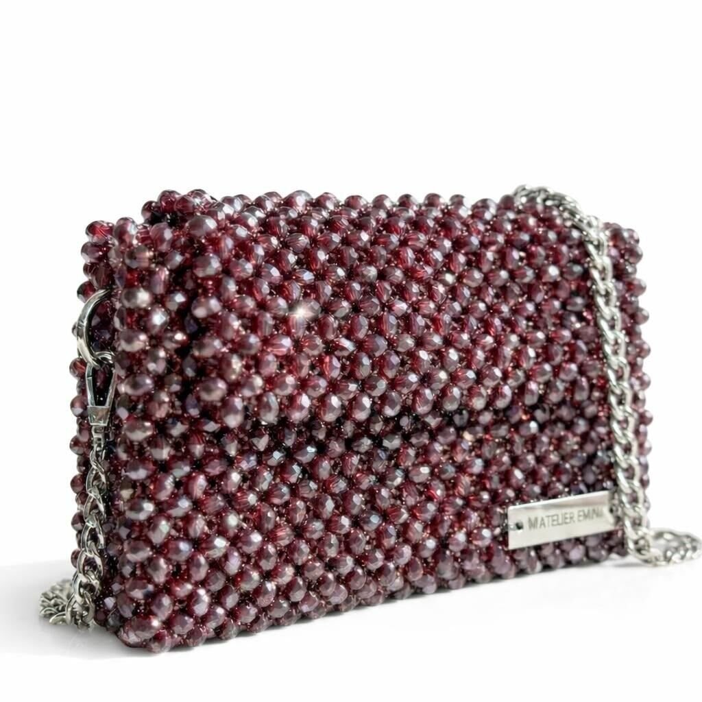 Atelier Emine’in Crystal Gelato Couture koleksiyonuna ait Panna Vino, 8 mm optik sınıfı kristal boncukların yüksek dayanımlı misina ile tek tek örülmesiyle üretilmiş, dikdörtgen formlu premium mini çanta modelidir.