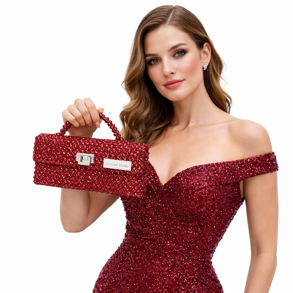 Atelier Emine’in Crystal Gelato Couture serisine ait Panna Wine, 8 mm optik sınıfı kristal boncuklar, üst taşıma kulpu, metal kilit mekanizması ve saten astar kullanılarak tamamen el işçiliğiyle üretilmiş premium top-handle clutch modelidir.