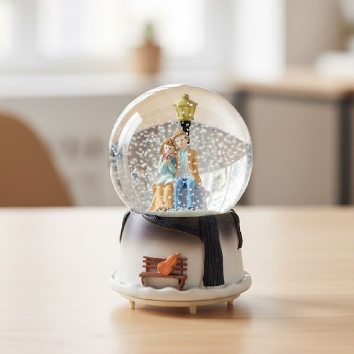 Pilli Işıklı Müzikli Kar Küresi–Kış Masalı Bankta Sevgili Figürlü Eğlenceli Masaüstü Biblo, LED Aydınlatmalı Dekoratif Hediyelik Kar Küresi