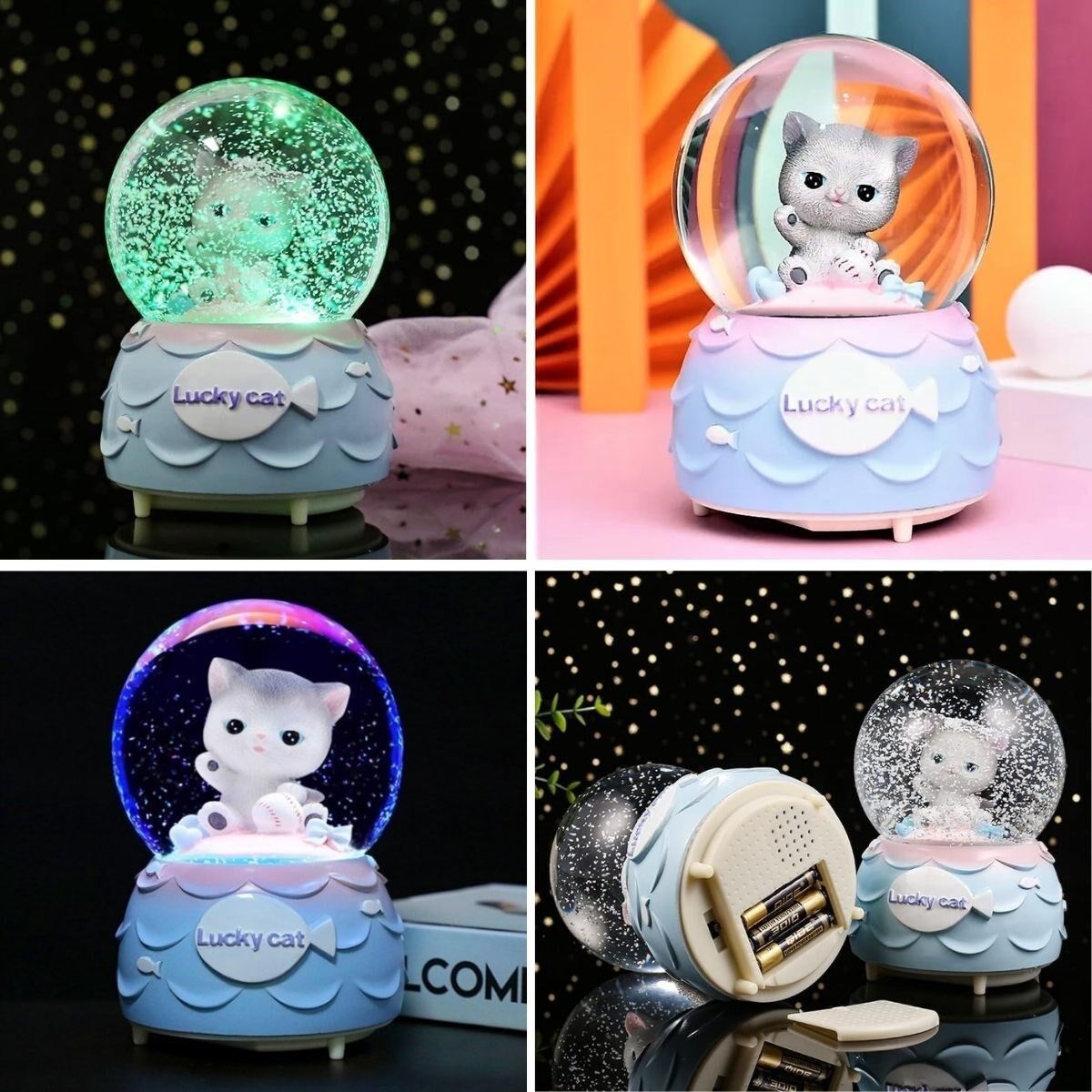 Pilli Işıklı Müzikli Kar Küresi–Şanslı Toplu Kedi Figürlü Eğlenceli Masaüstü Biblo, LED Aydınlatmalı Dekoratif Hediyelik Kar Küresi